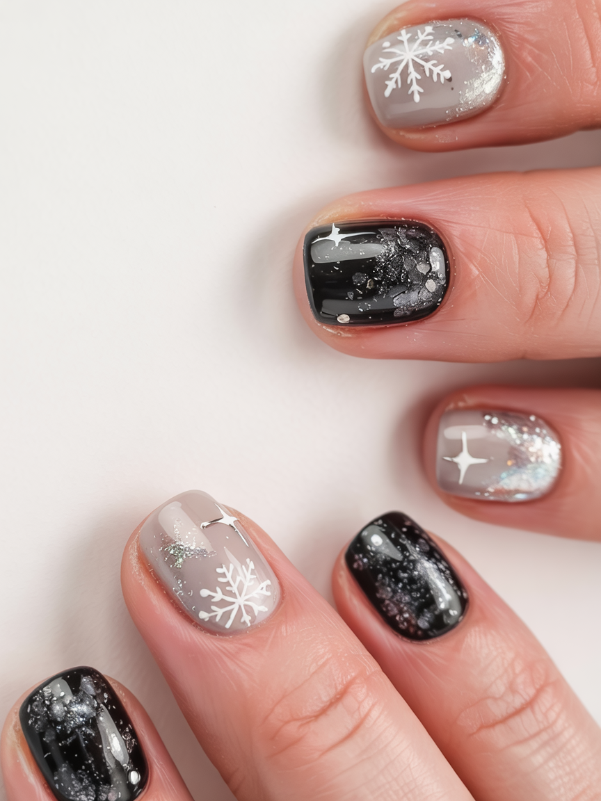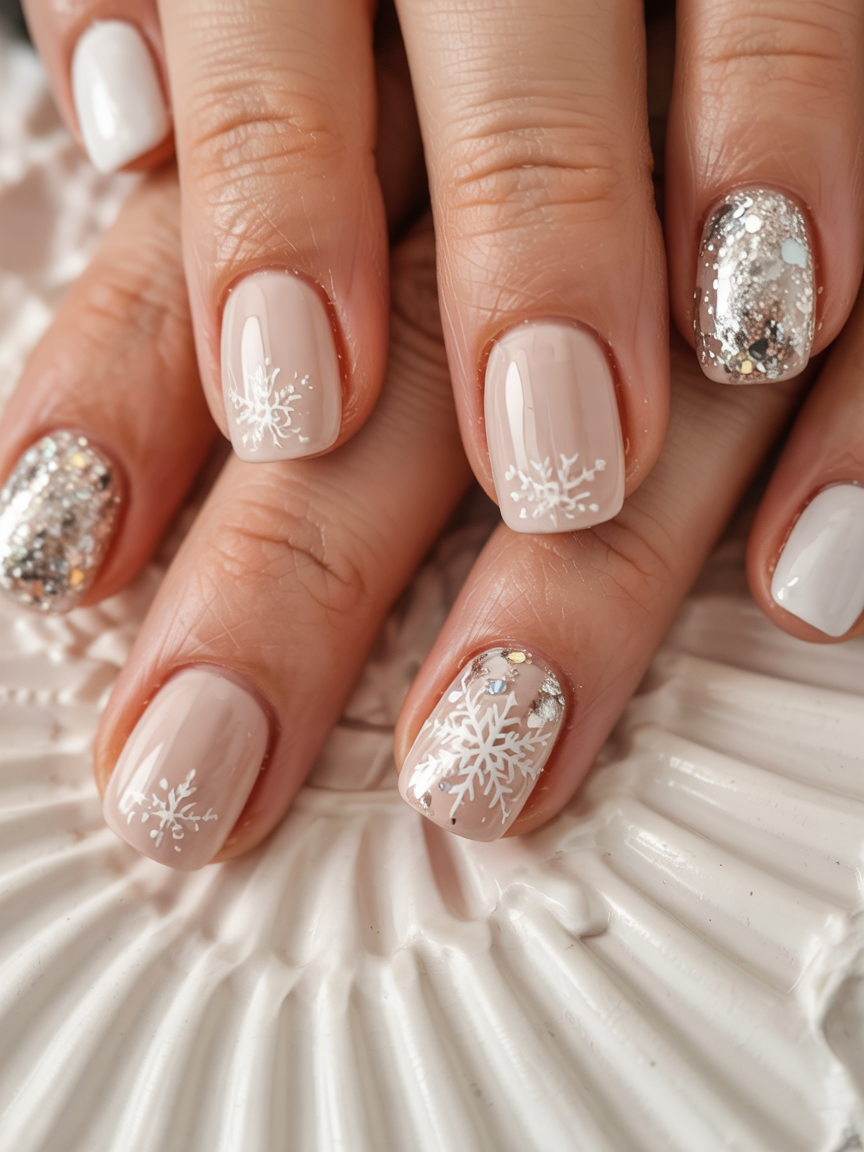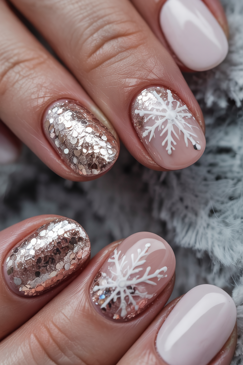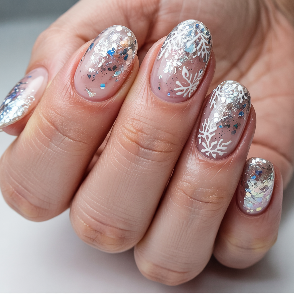 This one is nothing but winter glamour with silver sequins and snowflake accents. The design goes a step further by mixing glittery chrome nails and detailed snowflake art on a neutral base that spells out frost and festival at one go. It is like wearing holiday lights on your fingertips.
