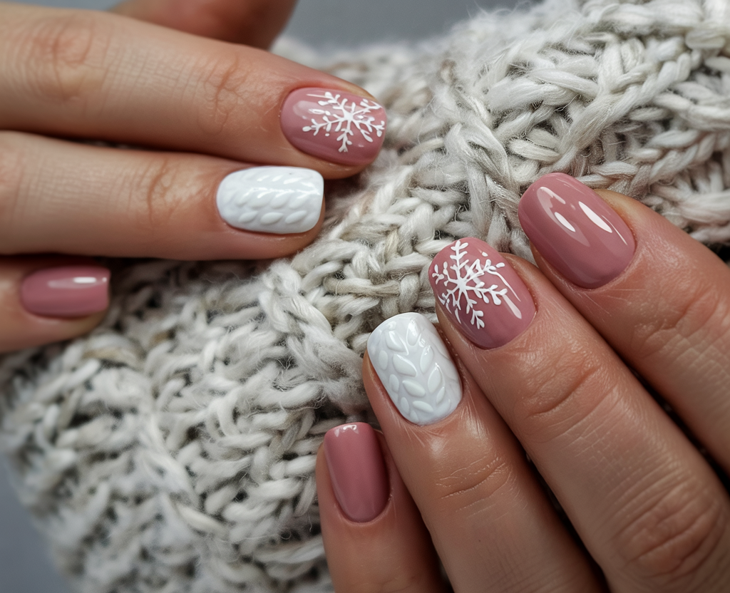 Warm pink tones with white snowflakes and knit-inspired textures make this manicure feel like your favorite winter sweater—cozy, familiar, and a little bit nostalgic. It’s just like homemade hot chocolate: the design comforts you but is still very much on-trend. The combination of matte and gloss finishes gives it a layered effect, making it stand out even more.