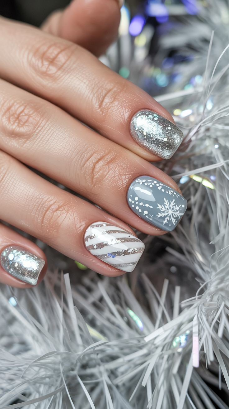 This manicure reminds you of frosty mornings and glittering holiday lights. The silver chrome nails shine like icy ornaments, while the grey snowflake and striped white anus provide character. It is fun, festive, and a touch daring while still being in perfect balance.