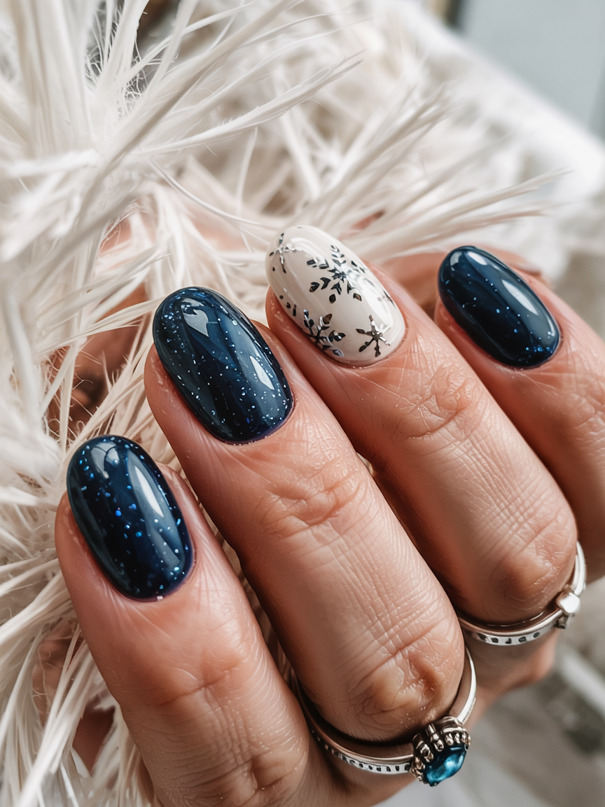 Glistening fingertips conjure up an image of that deep night-time sky. The dark blue base shimmers with tiny flecks of light – stars scattered across a cold December evening. The single accent nail is white, decorated with delicate snowflakes: cute, chic, and putting one in the mood to hear soft jingling bells while sipping on hot cocoa and watching snow drift down the windowpane. The balance between a playful winter source of inspiration and timeless elegance makes this look festive and classy.