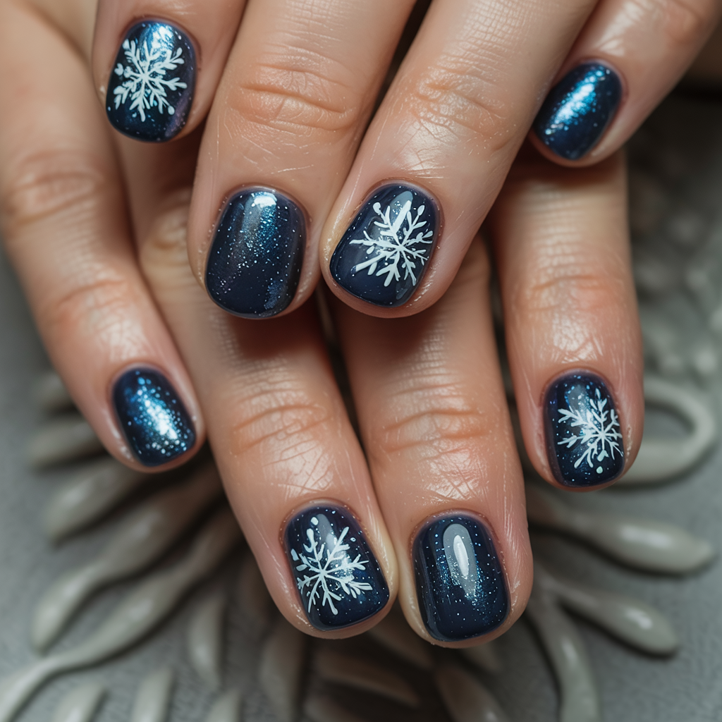 Deep navy nails sprinkled with delicate white snowflakes instantly transport you to a starry winter night. The shimmer of the base makes it look like frosted glass, while the snowflake art keeps it whimsical and fresh. It’s chic and bold, but still undeniably seasonal.