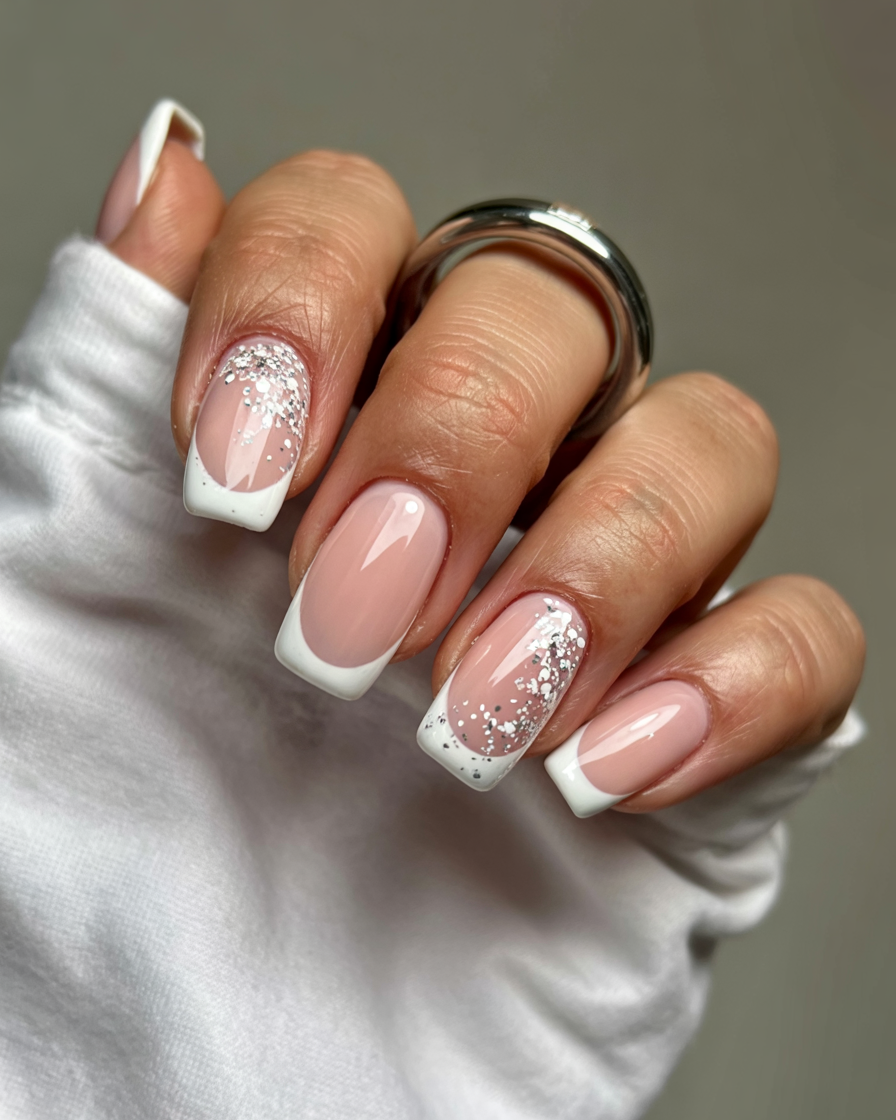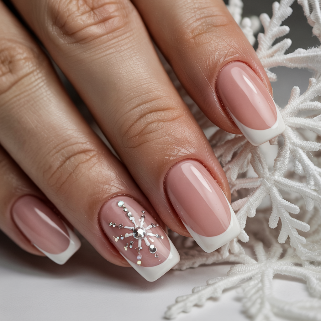 French tips with a winter twist—this design adds snowy glitter to a classic pink-and-white manicure. The result is timeless with just enough sparkle to make it festive. It’s chic, understated, and endlessly wearable.