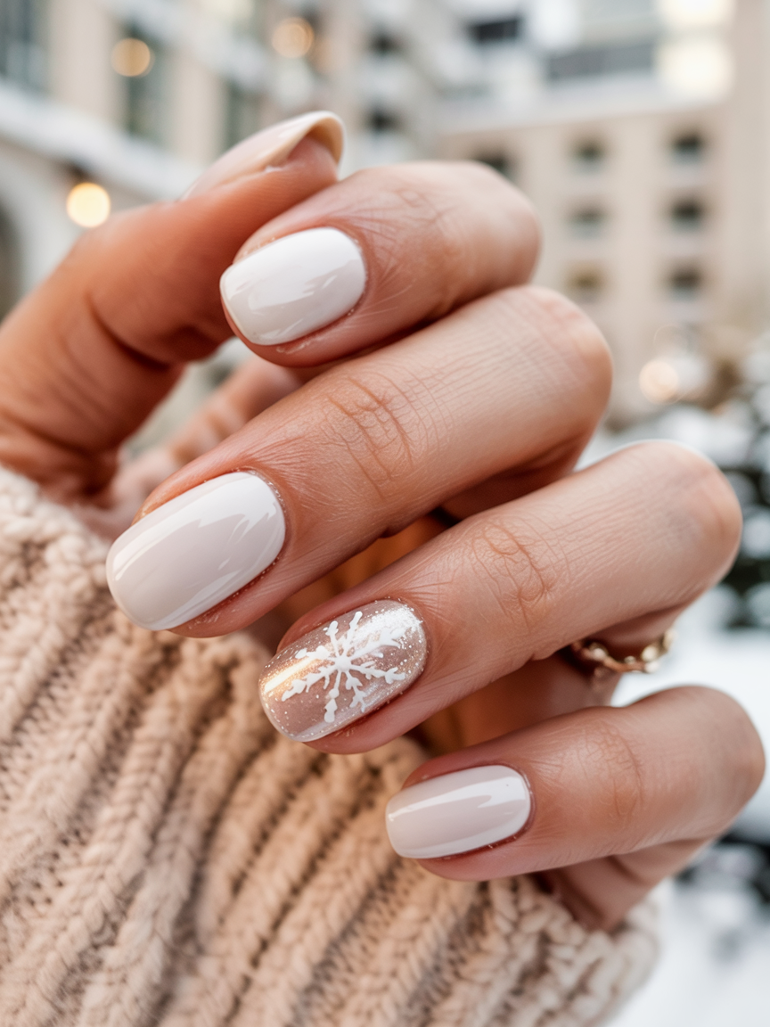 Clean, crisp, and quietly elegant—this manicure radiates winter freshness. The all-white nails feel sophisticated, while the single glittery snowflake accent adds charm. It’s subtle but never boring, and it channels that first-snow kind of excitement.