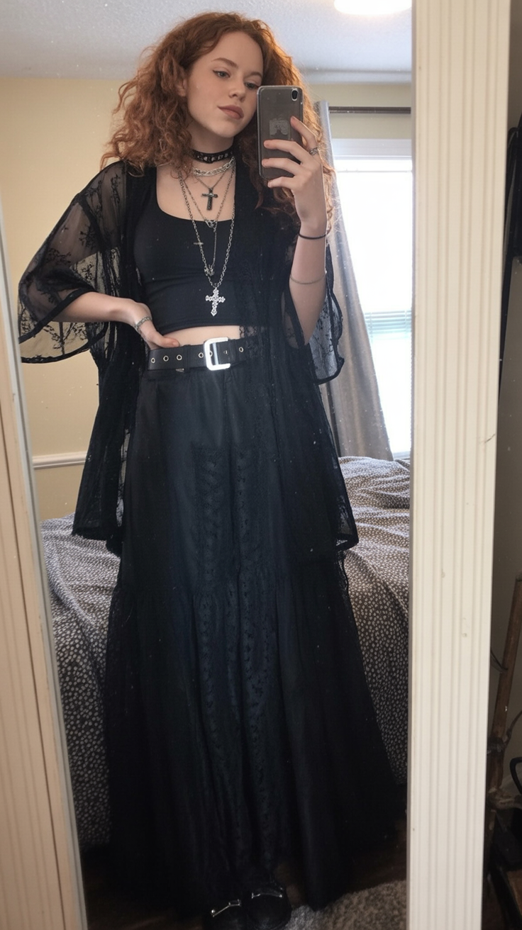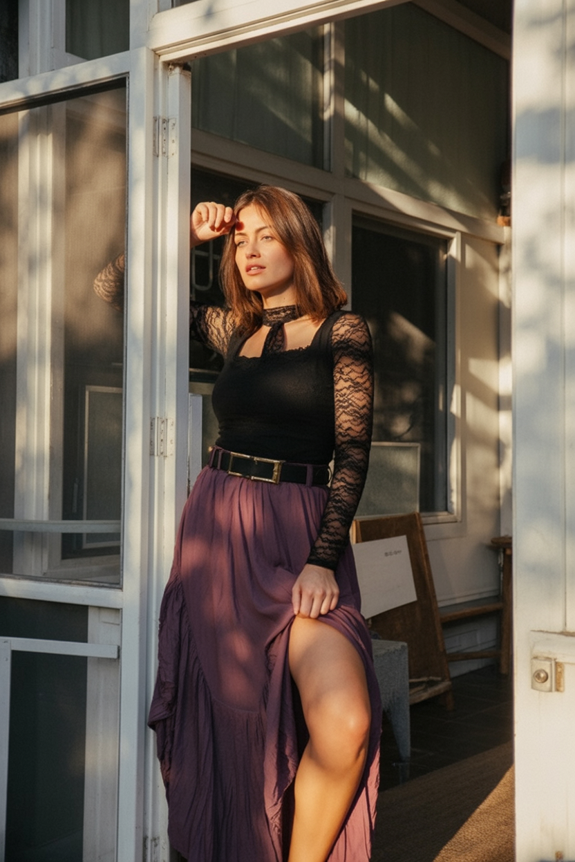 Ideal for a more casual boho spin on witchcore, this look shines in cooler autumn months. It’s perfect if you prefer comfort but still want a curated sense of style. Try it with boots and layered necklaces for depth. The look is especially flattering for women with pear-shaped bodies—the skirt softens the hips, and the sheer top subtly enhances the upper frame.