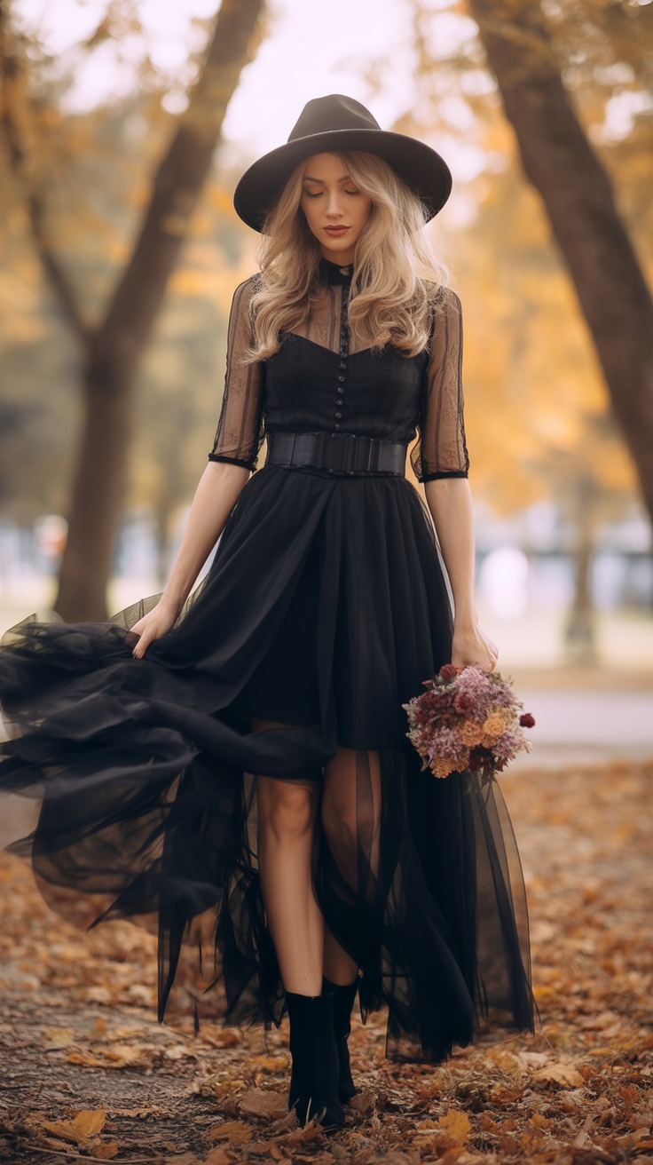 But not all fashion choices for witches have to be about drama—it’s okay to keep things low-key with just a black romper, tights, and some bold accessories in one’s reprieve belt. It’s like everything’s in balance with this particular fashion statement. It’s pulled off with some style in silver accessories and, also, in its black wide-brimmed fedora.