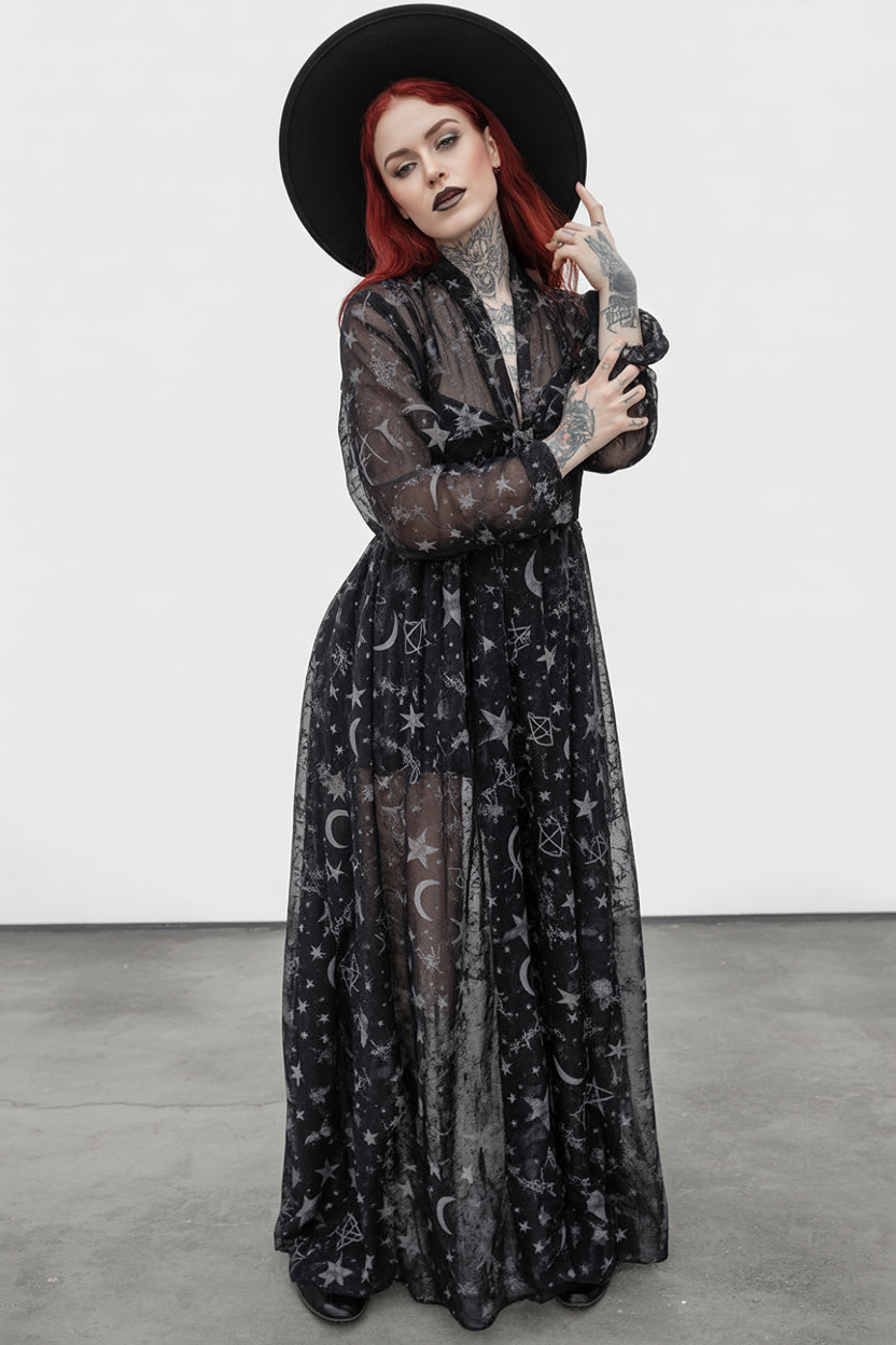 If you’re into dark fashion with playful symbolism, this one’s for you. The loose fit makes it a fabulous choice for plus-size and curvier figures, while the transparency gives room to layer creatively underneath—try a bodysuit, bralette, or slip. No rules here—just aesthetic vibes and cosmic energy.