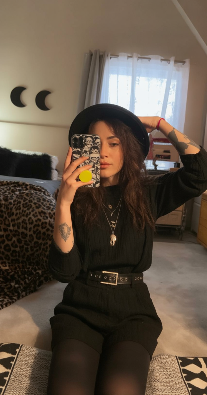 Channeling serious 90s grunge and goth energy, this look proves that witchy doesn’t always mean long gowns and lace. The cropped tank, layered necklaces, and maxi skirt with a sheer overlay are a modern nod to spellcasting in the city. It’s confident, edgy, and incredibly cool.
