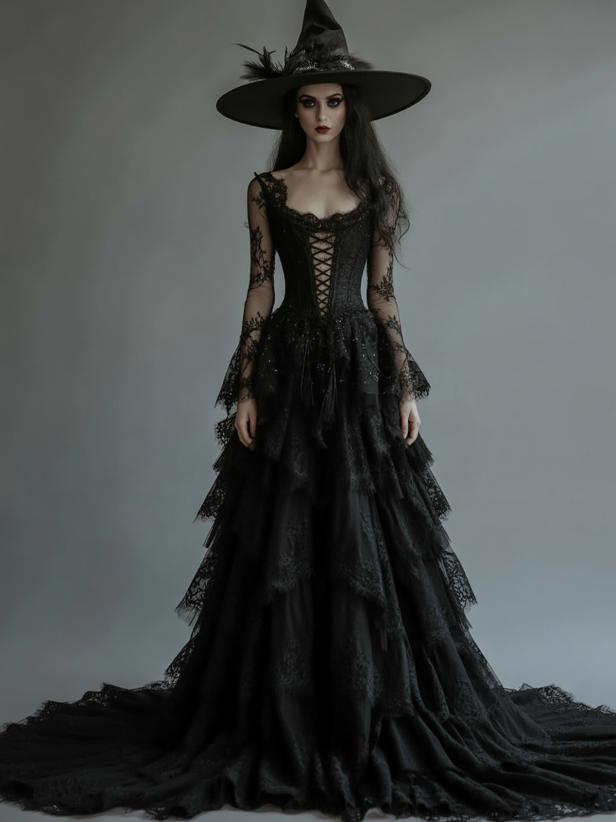 Straight out of a dark fairytale, this corseted gown with flared lace sleeves is pure high-fantasy majesty. The lace-up front, delicate trim, and sweeping skirt give it a royal, almost historic weight—like a noble witch welcoming you into her shadowy castle.