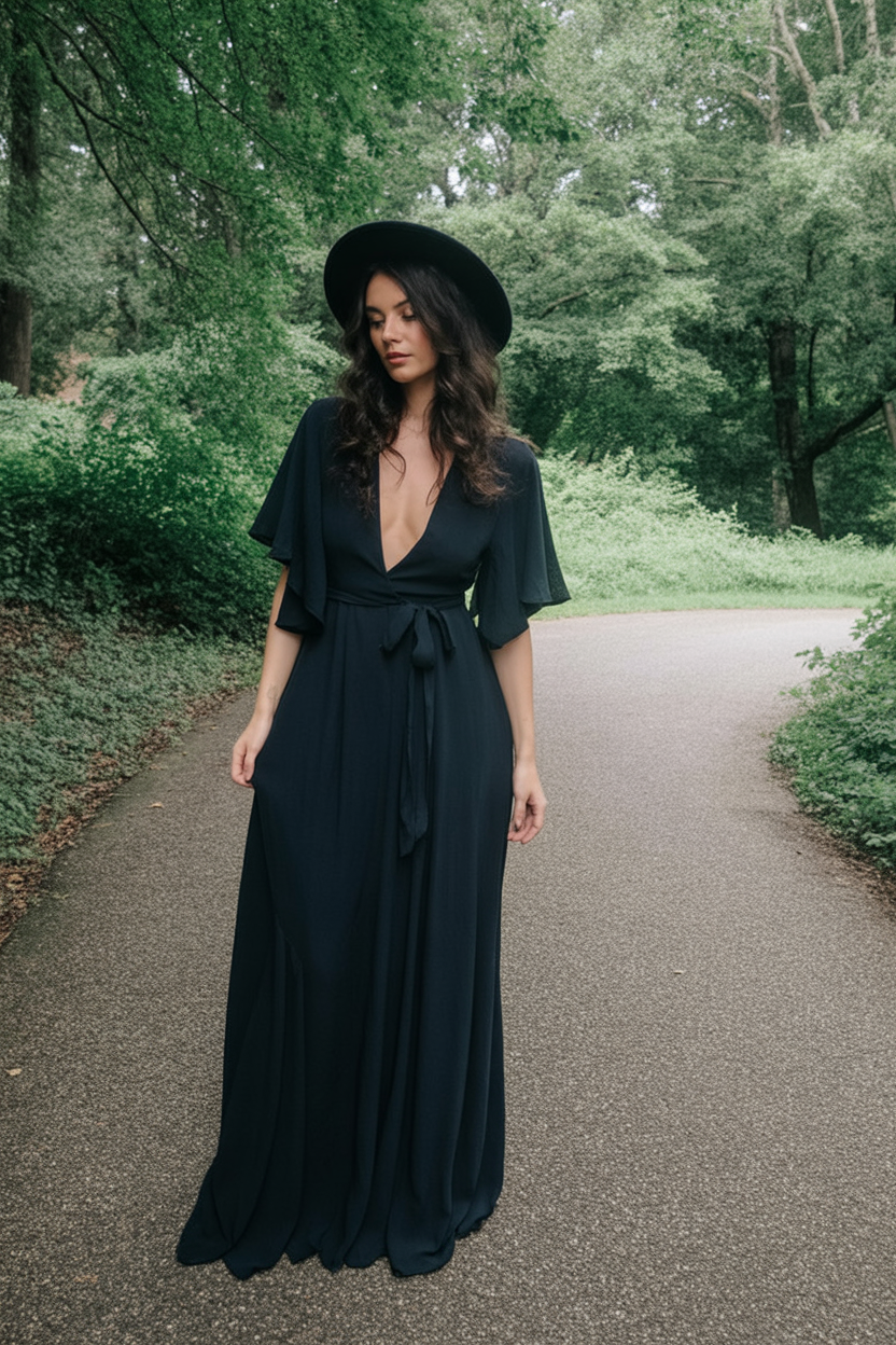 Soft, grounded, and quietly enchanting—this outfit channels the energy of a forest witch who knows every hidden path. The deep neckline and flutter sleeves feel delicate, while the black color keeps it rooted in classic witchy charm. It’s the kind of dress you wear barefoot under the trees, communing with ancient magic.