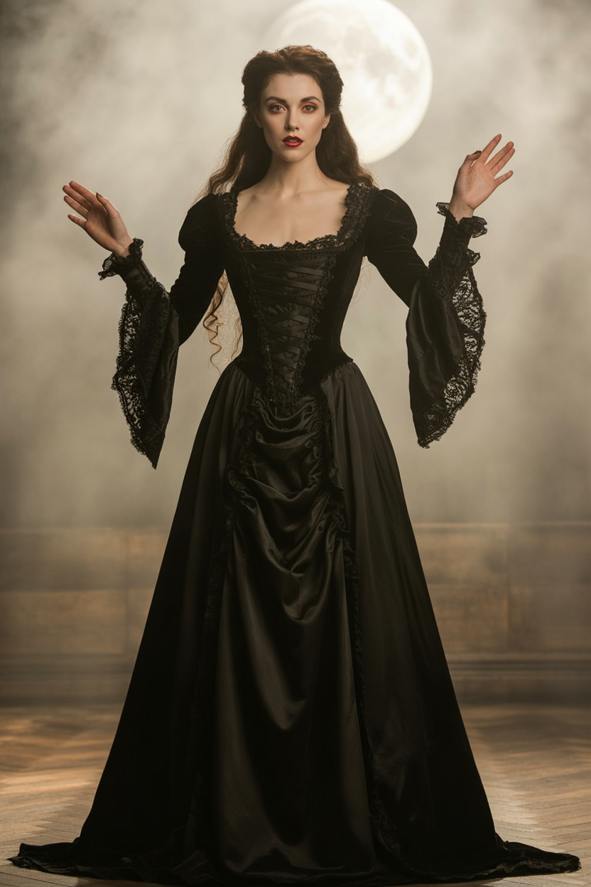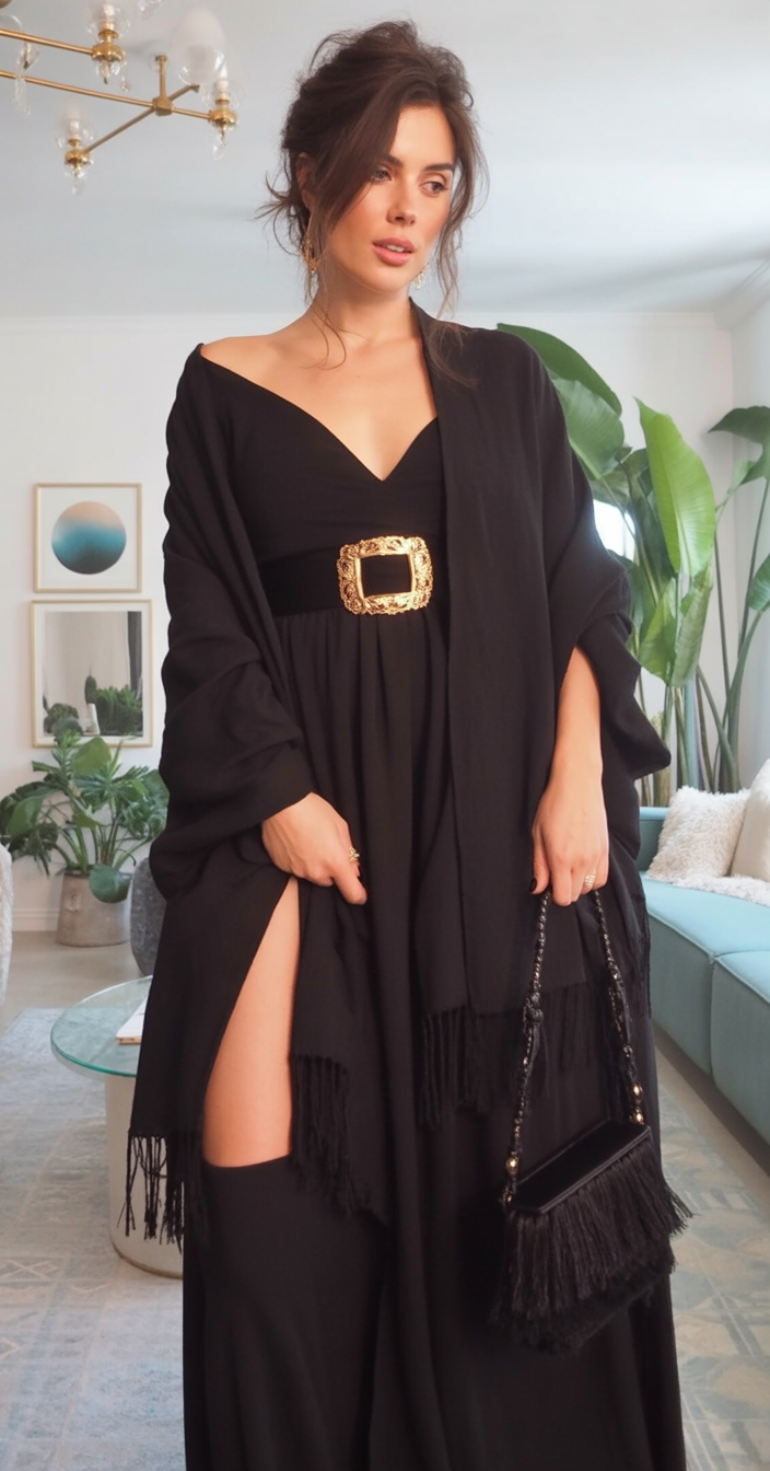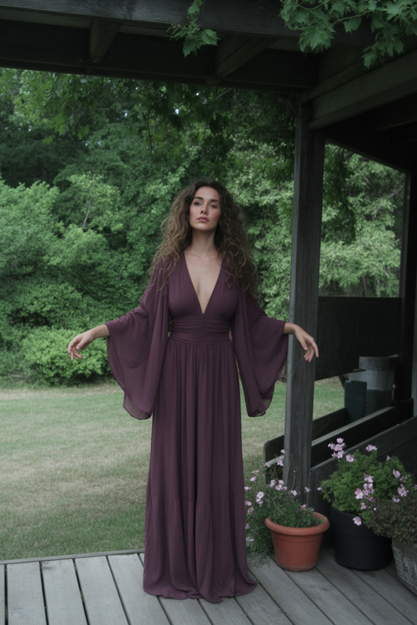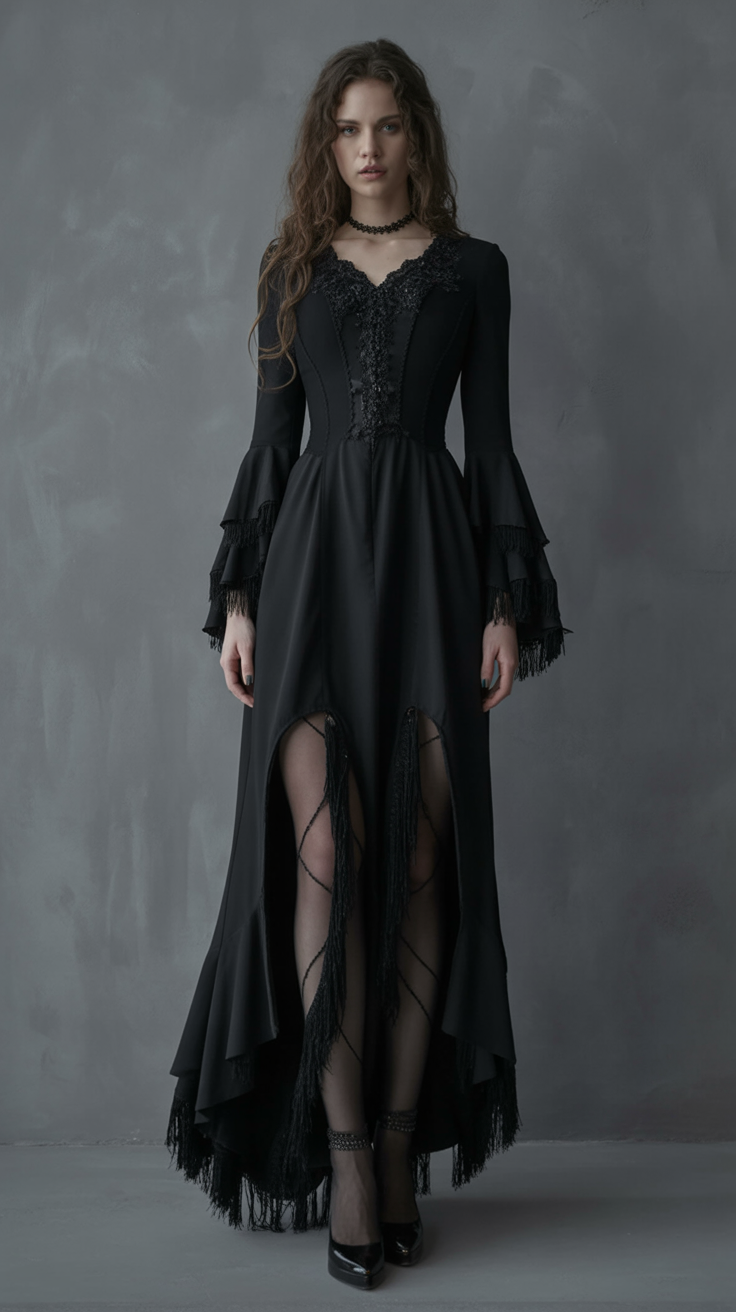 This look is perfect for women with a love for the gothic or dark bohemian vibe and works especially well on tall frames. The layered sleeves add drama for broader shoulders, while the fitted waist shapes curves effortlessly. If you have thicker thighs or long legs—flaunt them. Pair it with strappy heels and a matte lipstick in deep plum for a high-impact fall or winter aesthetic.