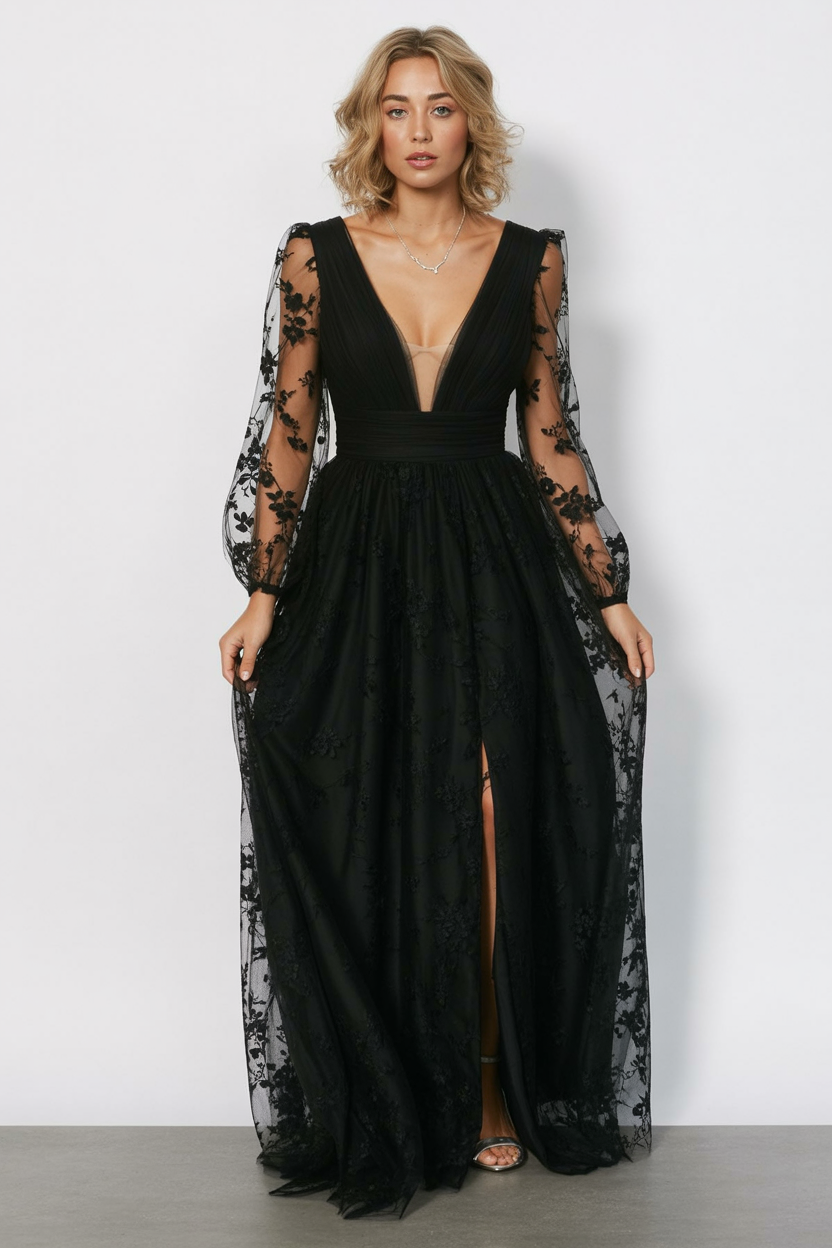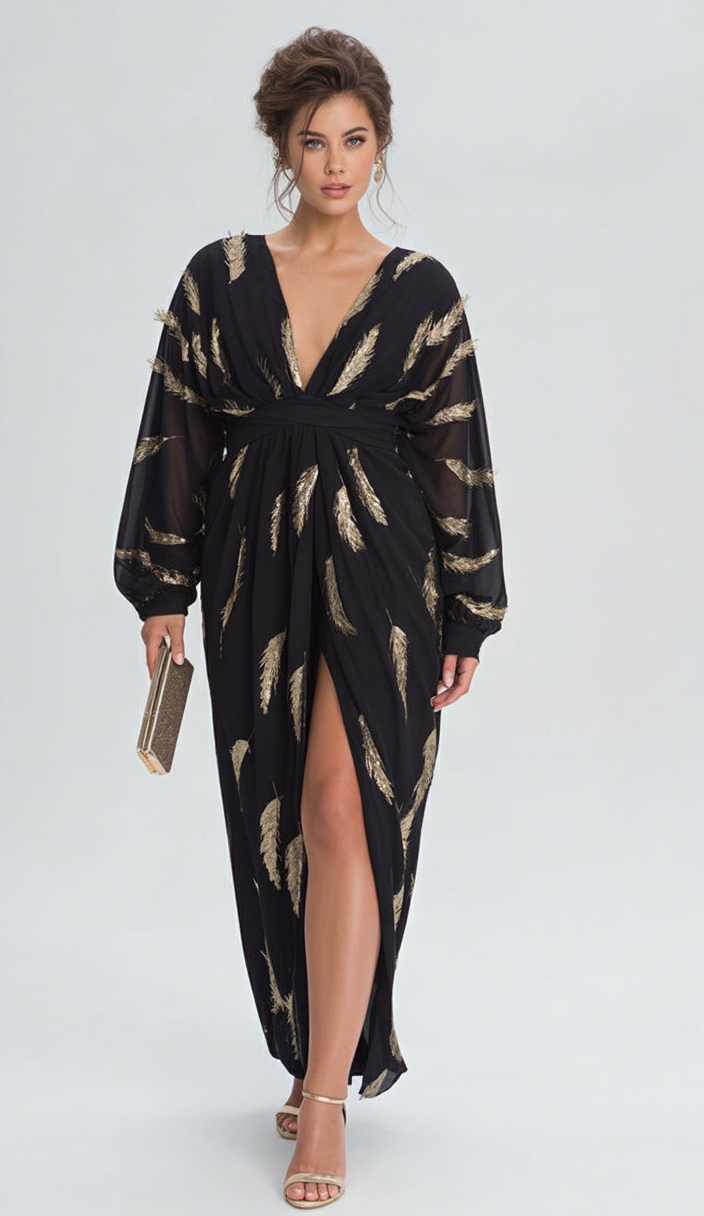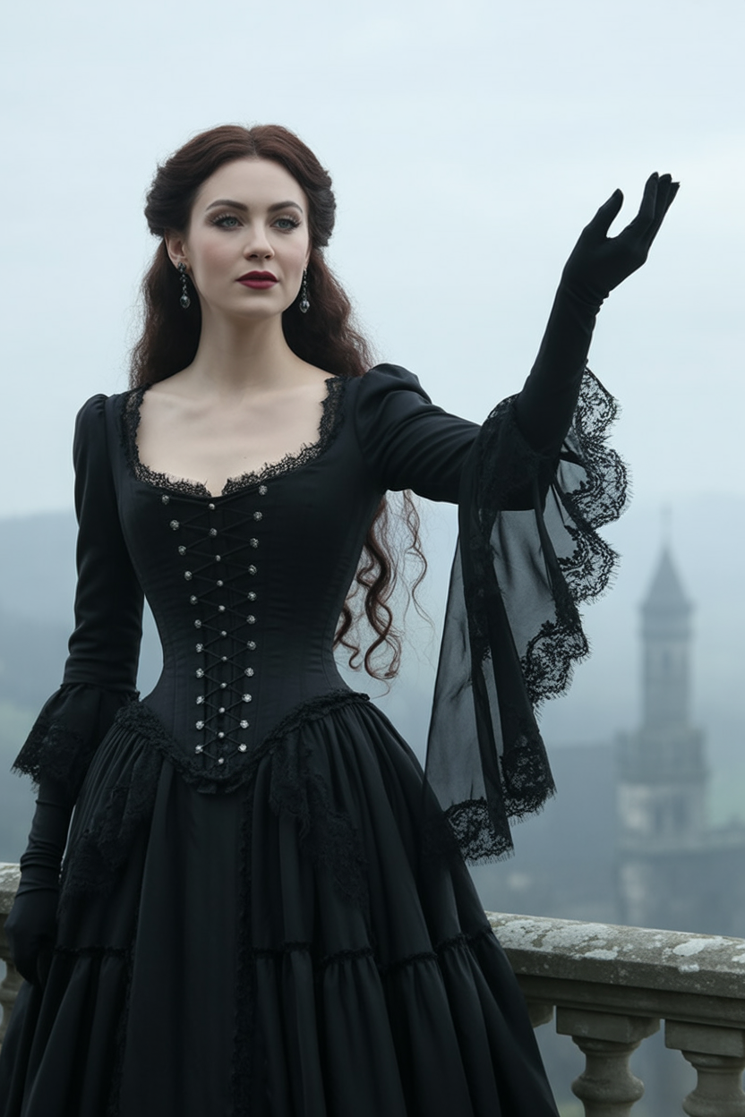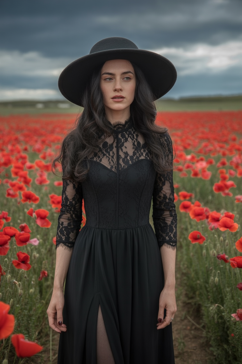 This look is perfect for women with a love for the gothic or dark bohemian vibe and works especially well on tall frames. The layered sleeves add drama for broader shoulders, while the fitted waist shapes curves effortlessly. If you have thicker thighs or long legs—flaunt them. Pair it with strappy heels and a matte lipstick in deep plum for a high-impact fall or winter aesthetic.