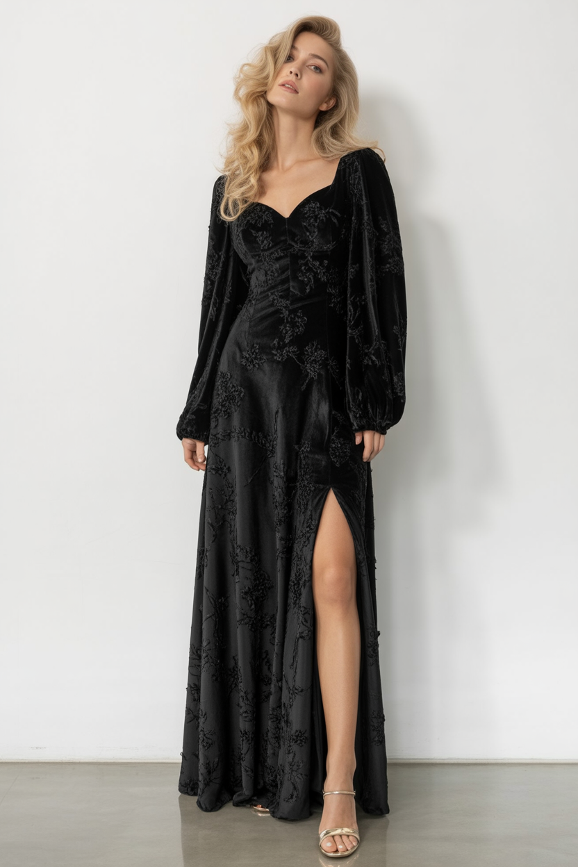 The richness of black velvet meets romantic structure in this timeless goth dream. The sweetheart neckline and puffed sleeves are full of vintage charm, while the front slit brings a dash of modern allure. It’s dramatic but never overdone—just bold enough to turn heads.