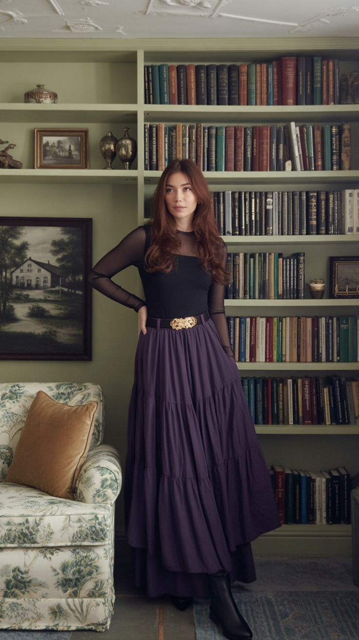 Effortlessly intellectual with a quiet strength, this outfit feels like sipping black tea in a candlelit library surrounded by tarot decks and vintage poetry. The sheer black mesh top adds just enough mystery without screaming for attention, while the flowing tiered purple skirt sways with a grace that’s grounded, romantic, and oh-so-witchy.