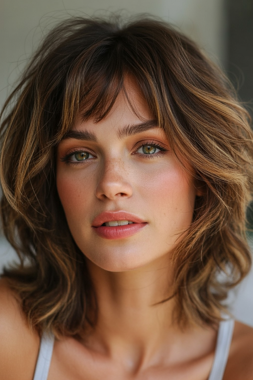 It’s best suited for medium hair types that love a bit of volume. A texturizing spray and light curl with a wand will keep it effortlessly tousled all day. The face-framing bangs add that extra spark—perfect for highlighting your eyes and giving the whole look a soft, youthful edge.
