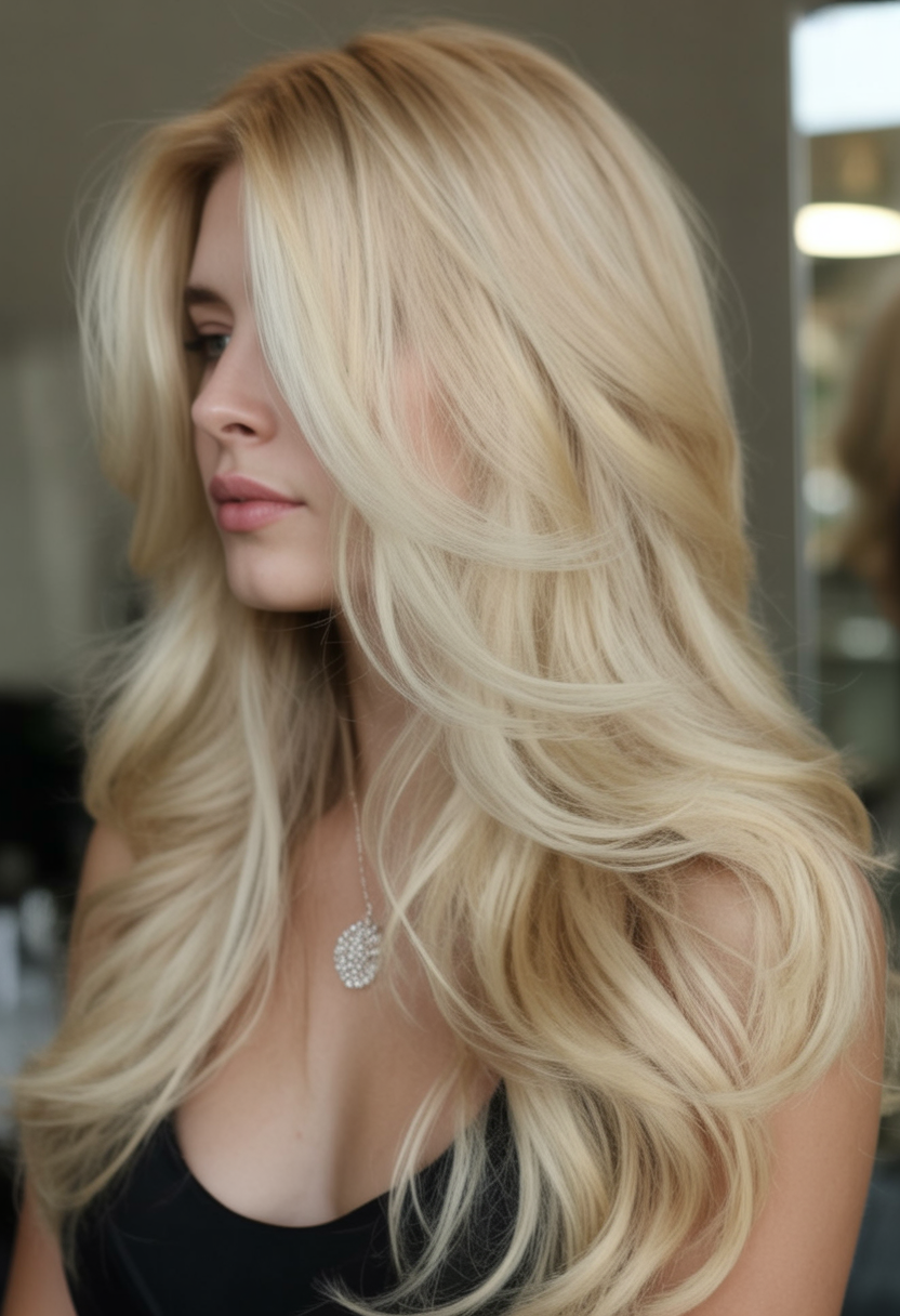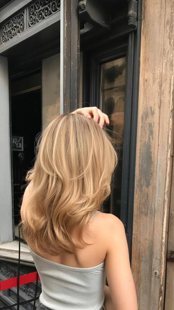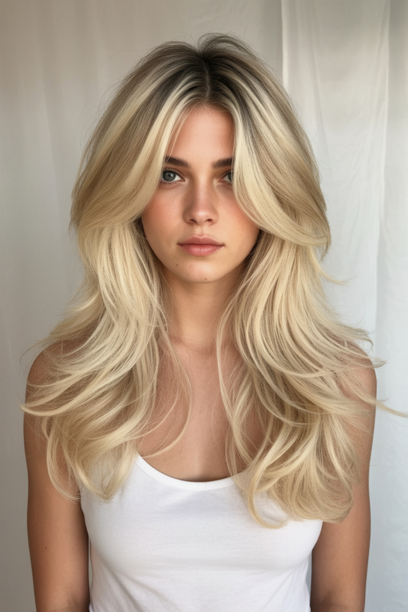This haircut shines on long hair with medium density and a bit of wave. The layers give the illusion of thicker strands and can easily be styled with a large barrel brush for that full, bouncy finish. The best part? It grows out beautifully, keeping its flattering frame and easy movement. You’ll love how it catches the light and complements every outfit—from denim to date-night dresses.