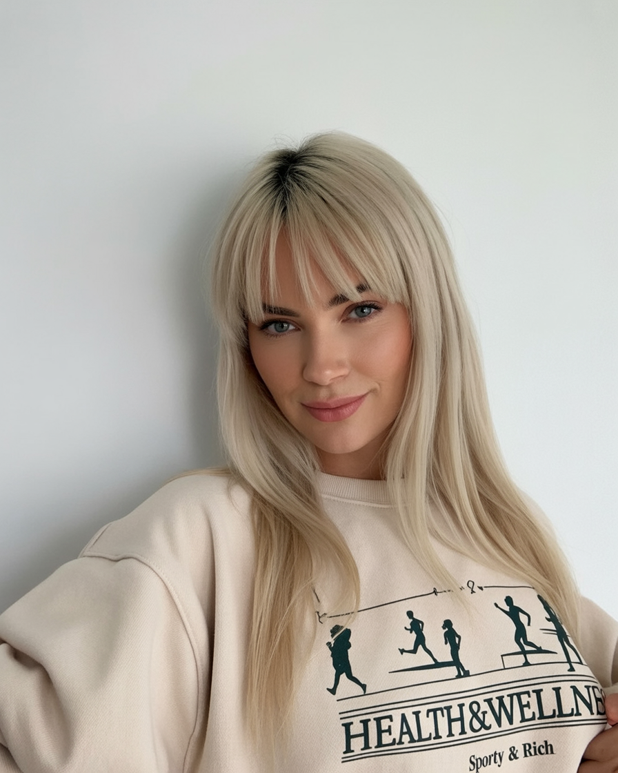 This sleek straight hair with bangs channels the clean, minimalist energy that made early 2000s style so iconic. The fringe softens the face while keeping the whole look polished and youthful. It’s that “model off-duty” charm that works from day to night, pairing beautifully with cozy sweaters or tailored blazers alike.
