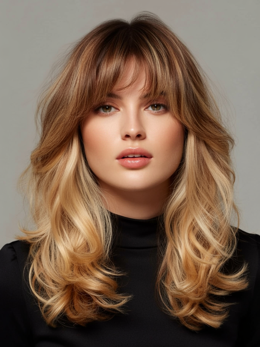 This layered ombre cut with bangs feels like a modern revival of the grunge-meets-glam Y2K vibe. The golden ends blend into rich caramel roots, creating warmth and depth that flatters every skin tone. With a soft wave and airy texture, it’s the kind of look that feels lived-in and confident—like the cool girl who always knows exactly what she’s doing.