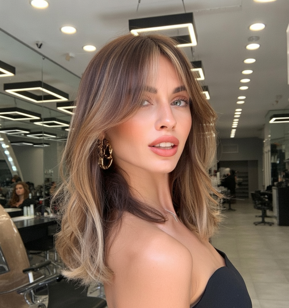 Mid-length layers paired with breezy bangs are the ultimate nod to the Y2K revival—equal parts flirty and sophisticated. The soft volume and light ends make the whole look feel lifted, bright, and youthful. It’s the type of haircut that instantly adds dimension and draws attention to the eyes.