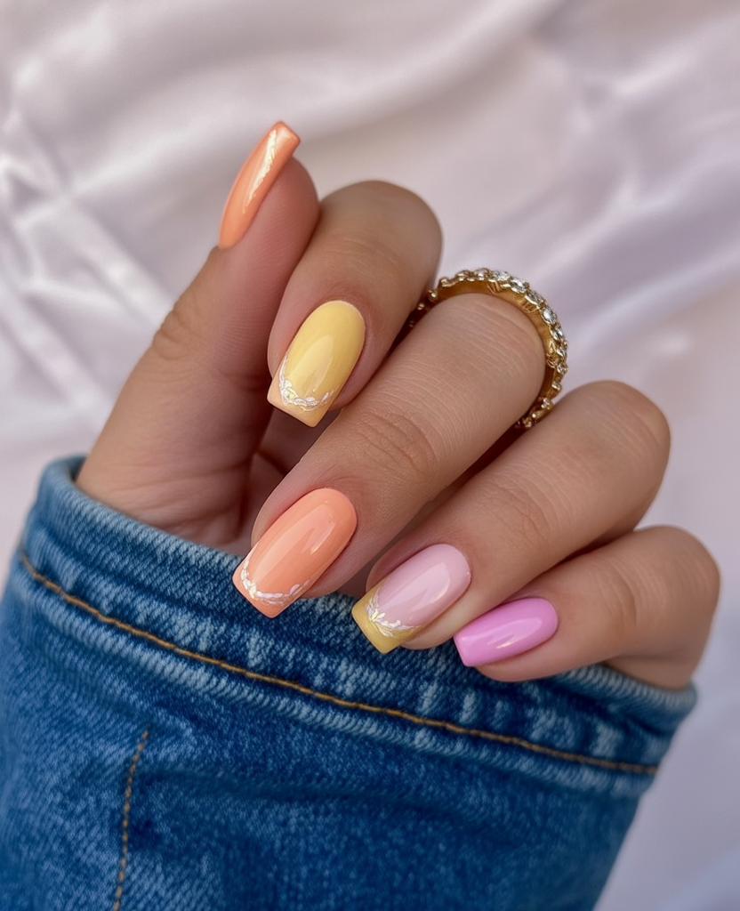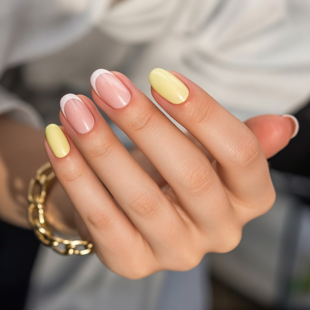 This manicure is pure spring joy. The mix of pastel shades—soft pink and sunny lemon—feels playful, fresh, and full of personality. It has that carefree vibe that instantly puts you in a good mood, like the first day you leave the house without a jacket.