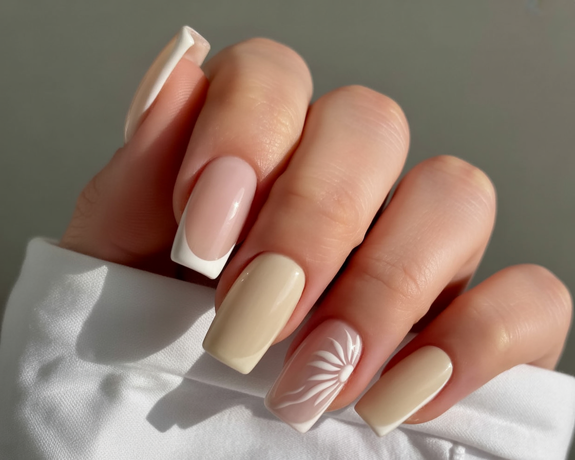 This is a great option if you love simple styles with a hint of art. It works beautifully on medium-length square nails and suits women who prefer timeless looks with a seasonal twist. The neutral tone makes it easy to maintain, and the floral accent keeps it feeling fresh and relevant for spring.