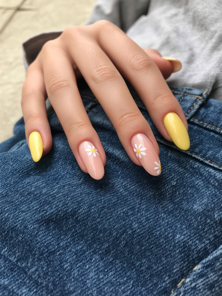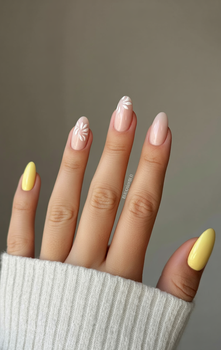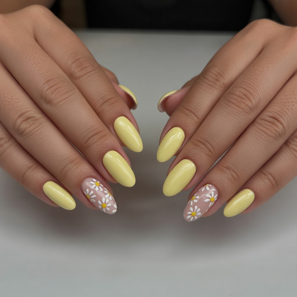 23. Soft Lemon Almond Nails with Daisy Accent Nails