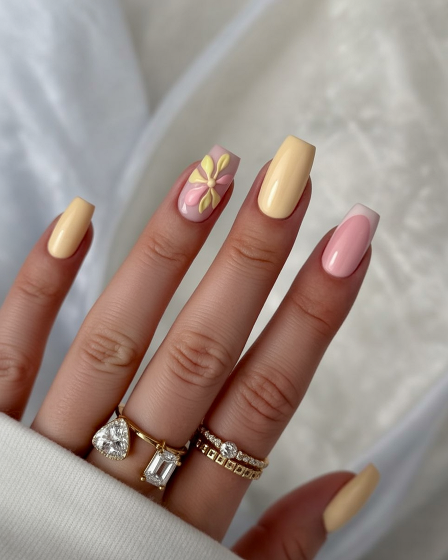 13. Butter Yellow and Pink Nails with Soft Flower Accent