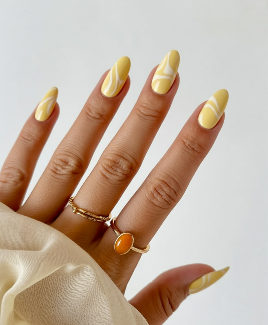 This manicure feels bold in a very modern, confident way. The creamy yellow base instantly says spring, while the white wave art adds movement and personality. It’s fresh, a little graphic, and perfect if you like your nails to feel intentional and fashion-forward without being over the top.