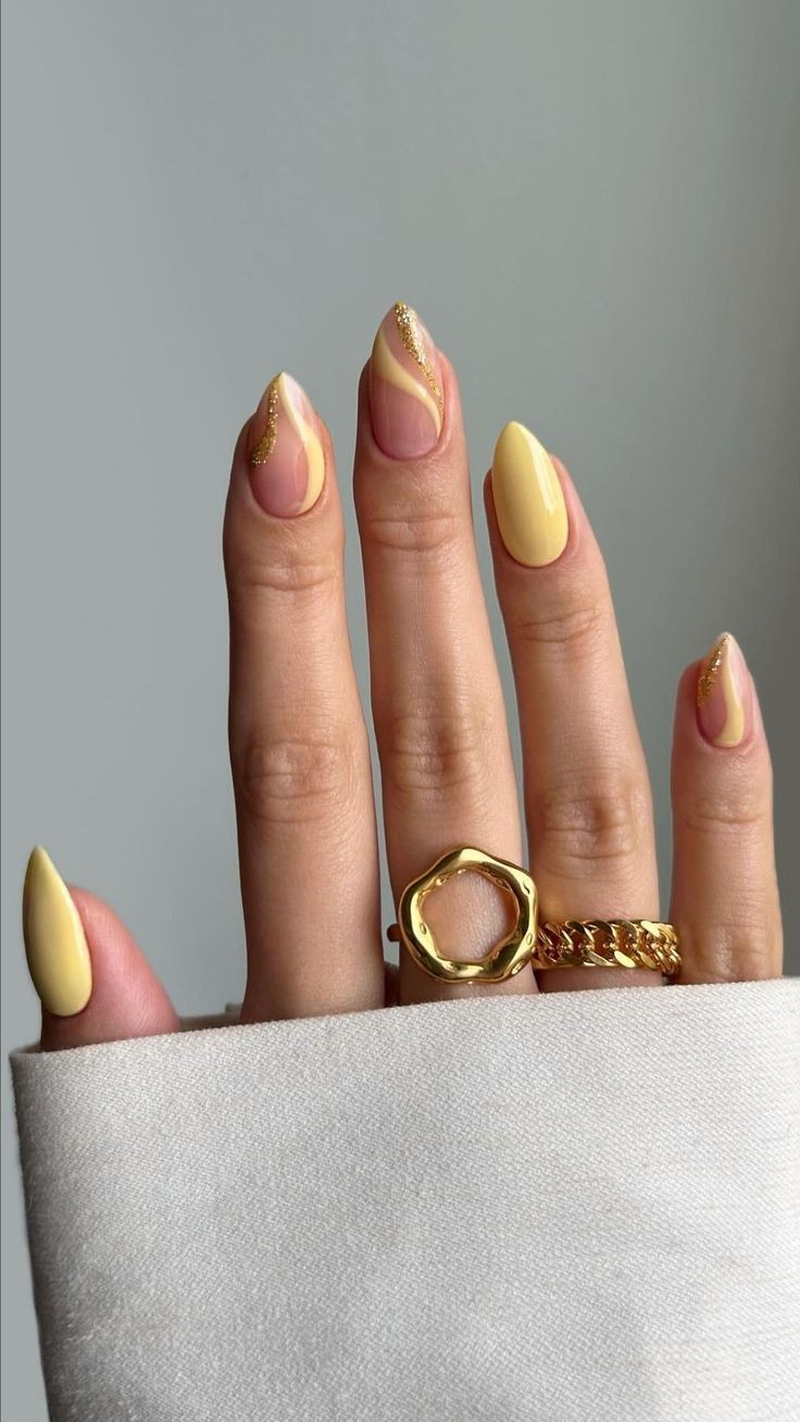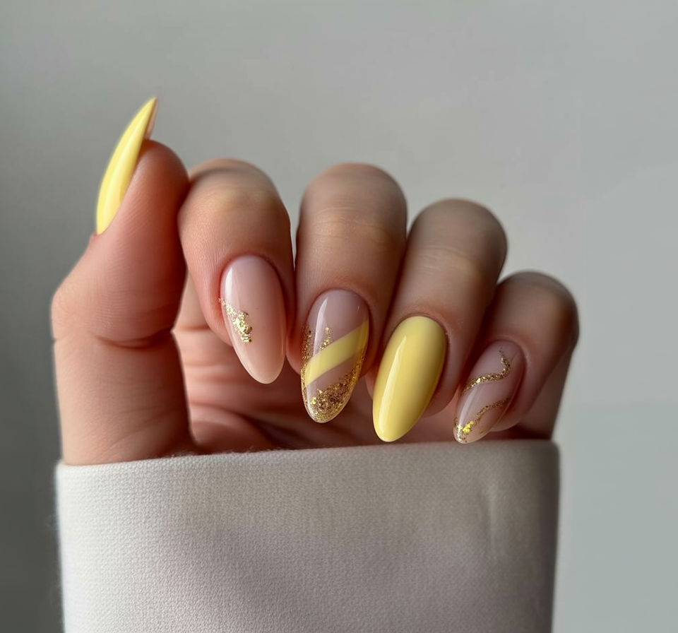 15. Lemon and Nude Almond Nails with Gold Art Accents