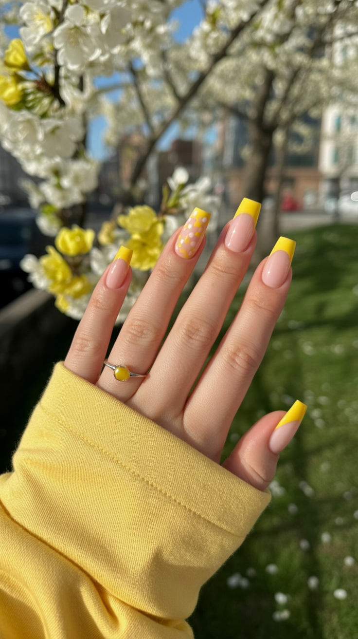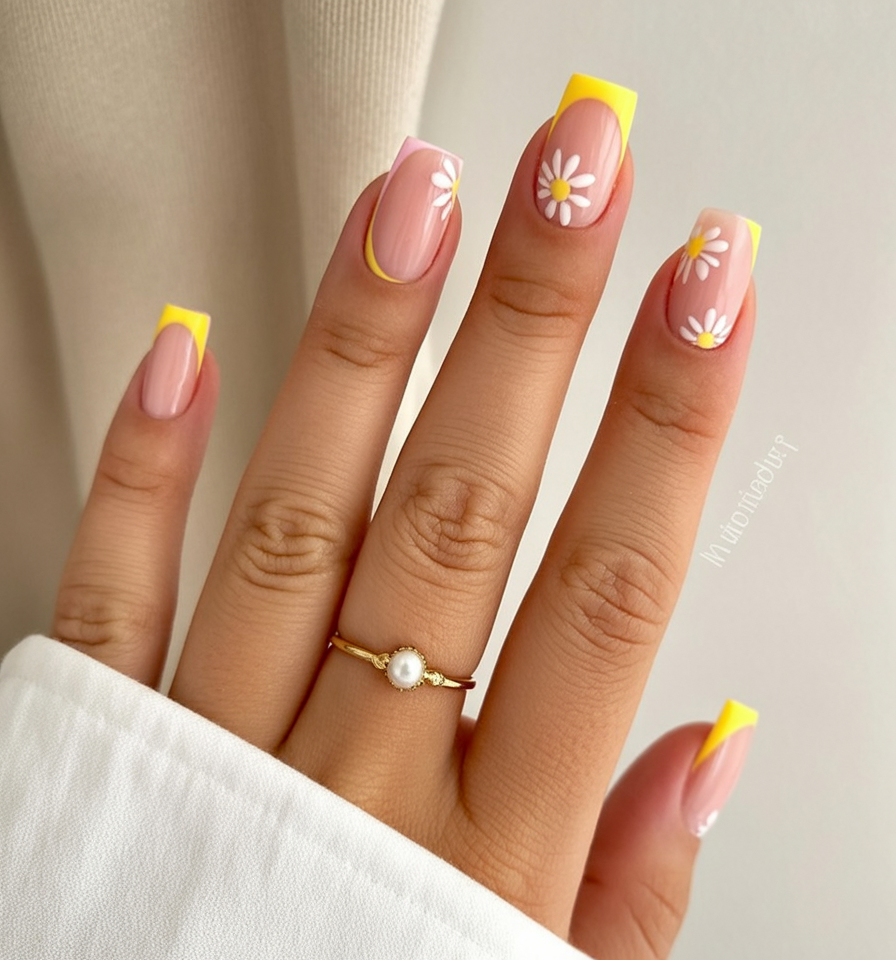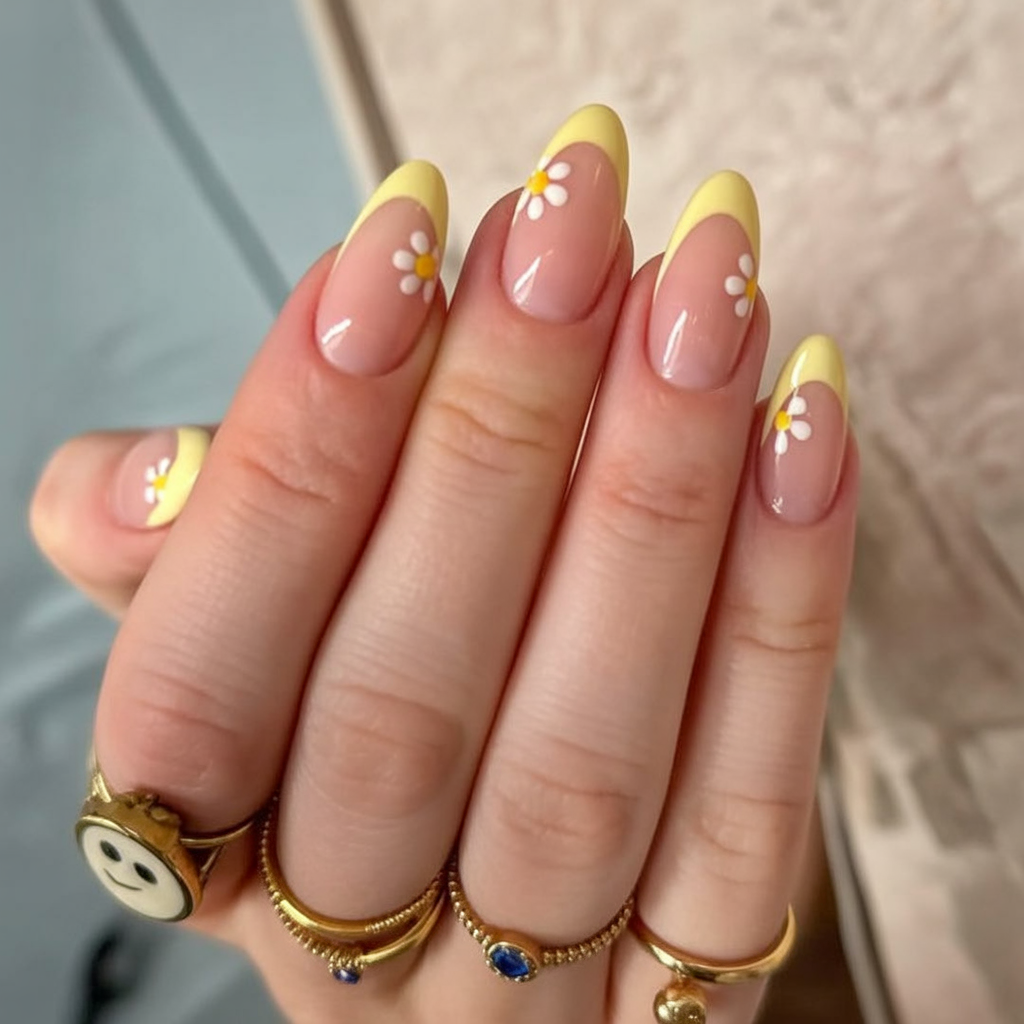 This design feels lighthearted and sweet, like the first sunny morning after a long winter. The soft lemon French tips instantly brighten the nails, while the tiny daisy accents add a playful, feminine touch. It’s cheerful without being loud, making it perfect for everyday spring wear.