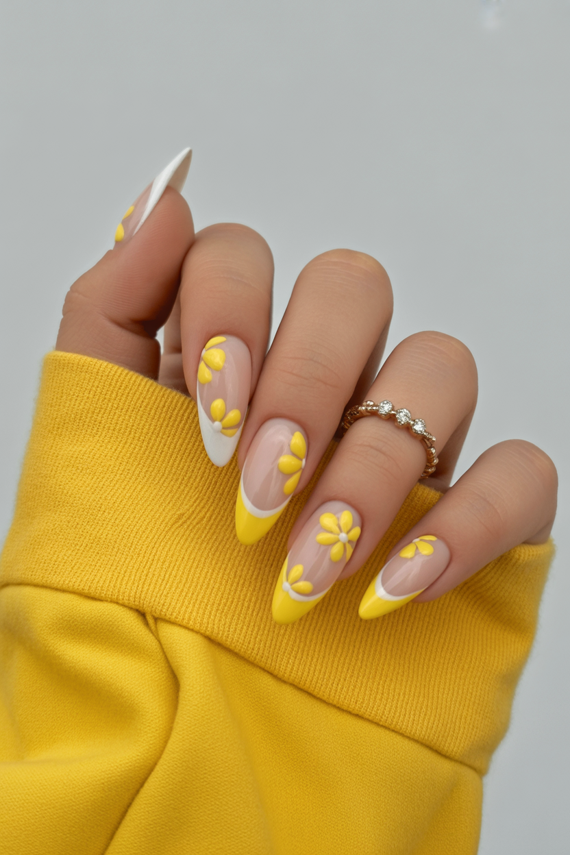 11. Glossy Yellow Almond Nails with Daisy Accents