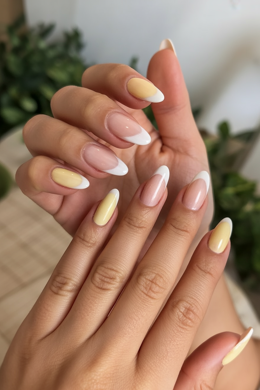 19. Lemon and Blush Almond Nails with Diagonal Color Split
