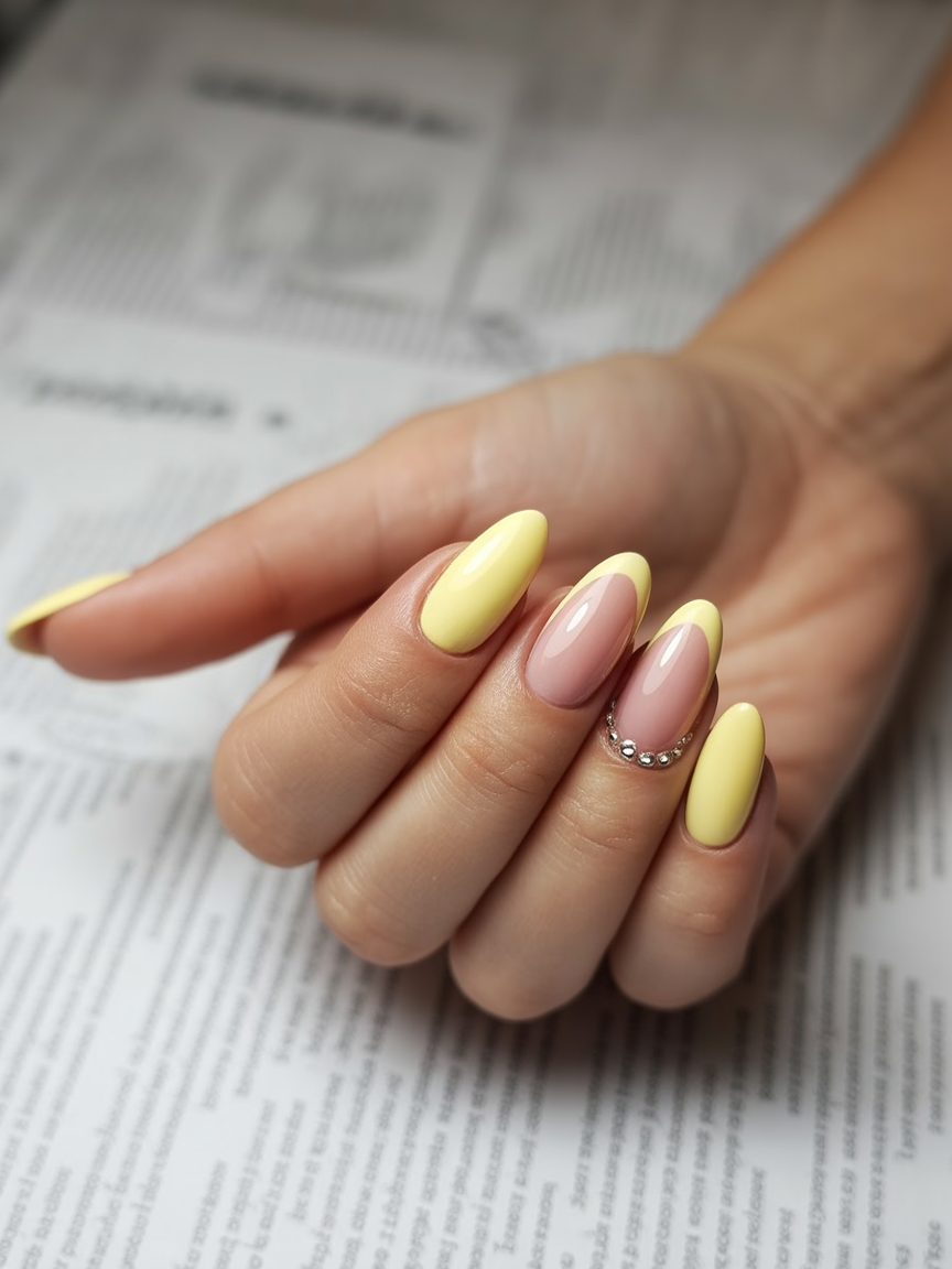 20. Soft Lemon and Pink Almond Nails with Minimal Accent Ring