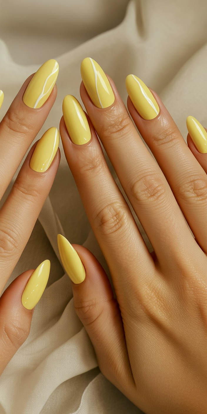 22. Glossy Lemon Almond Nails with Minimal White Line Art