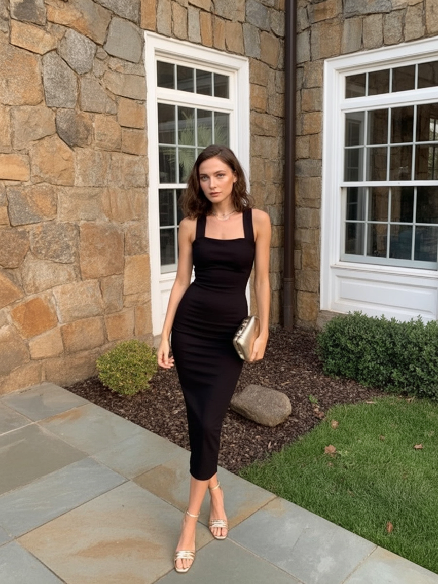This look is perfect for women who appreciate classic silhouettes and rich textures—and it’s stunning for indoor winter parties or black-tie birthdays. Works best for hourglass and full-busted shapes, as the neckline flatters without overwhelming. Add pearls and a soft blowout, and let your entrance do the talking.