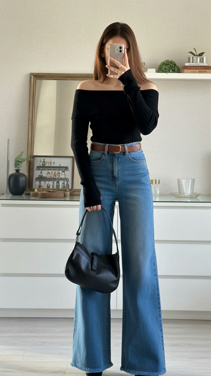 If you’re more of a soft glam kind of girl, this look speaks your language. The off-the-shoulder black top adds subtle sexiness without baring it all, while the wide-leg denim keeps the vibe grounded and cool. It’s the perfect in-between of dressed up and casual—think classy dinner turned spontaneous bar crawl.