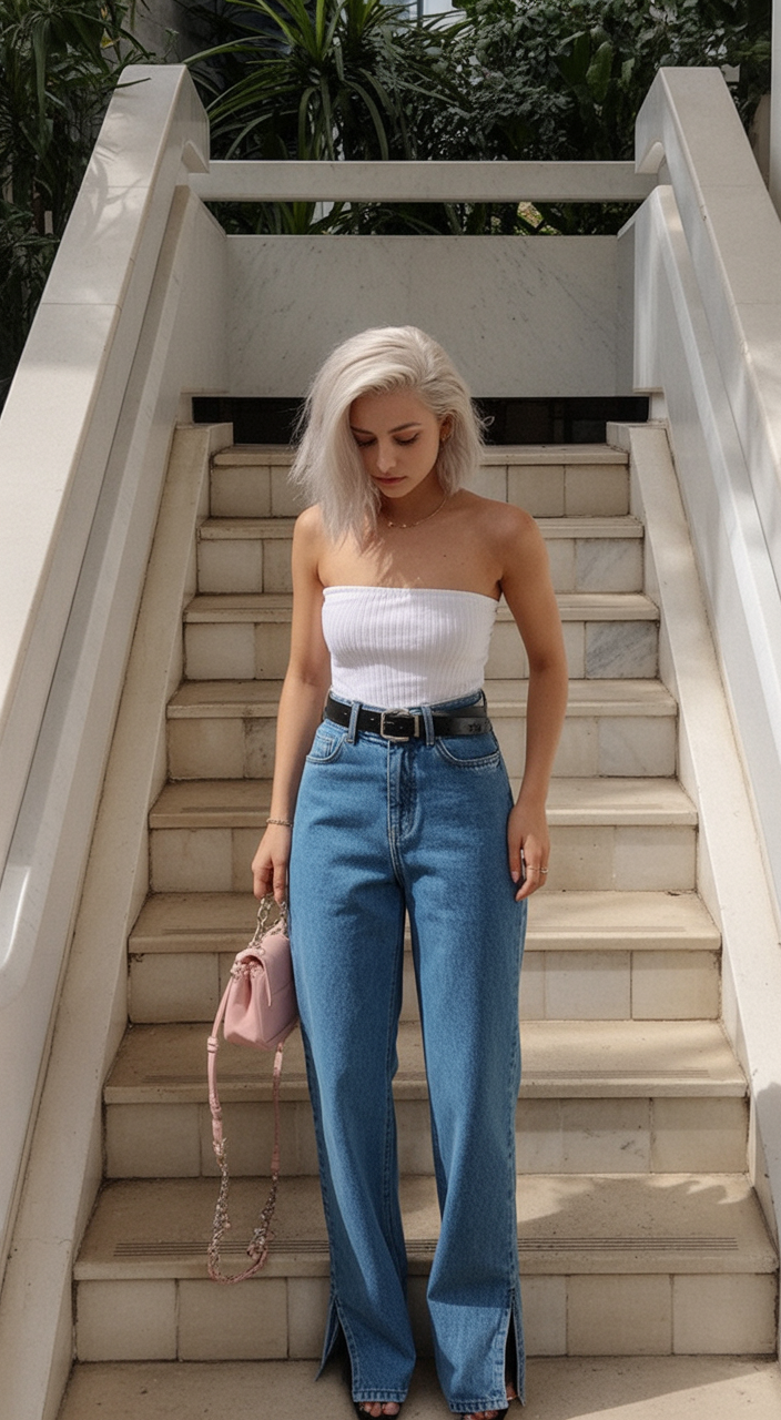 Sunshine on your skin, a chilled spritz in hand, and this outfit? You’ve just nailed birthday perfection. The tube top brings all the early 2000s nostalgia in the best way possible—paired with high-waist jeans and a baby pink mini bag, it’s giving Y2K inspo with a clean, current twist.