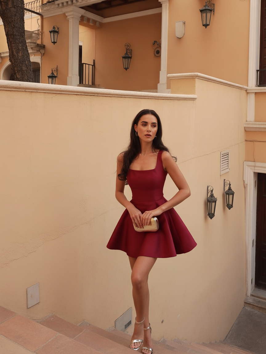 This red-hot number is giving flirty birthday princess—but make it grown. The structured bodice and flared mini skirt make twirling an inevitability, while the deep wine hue feels rich, romantic, and a little daring. It’s that one look that makes you feel instantly lifted and lit from within.