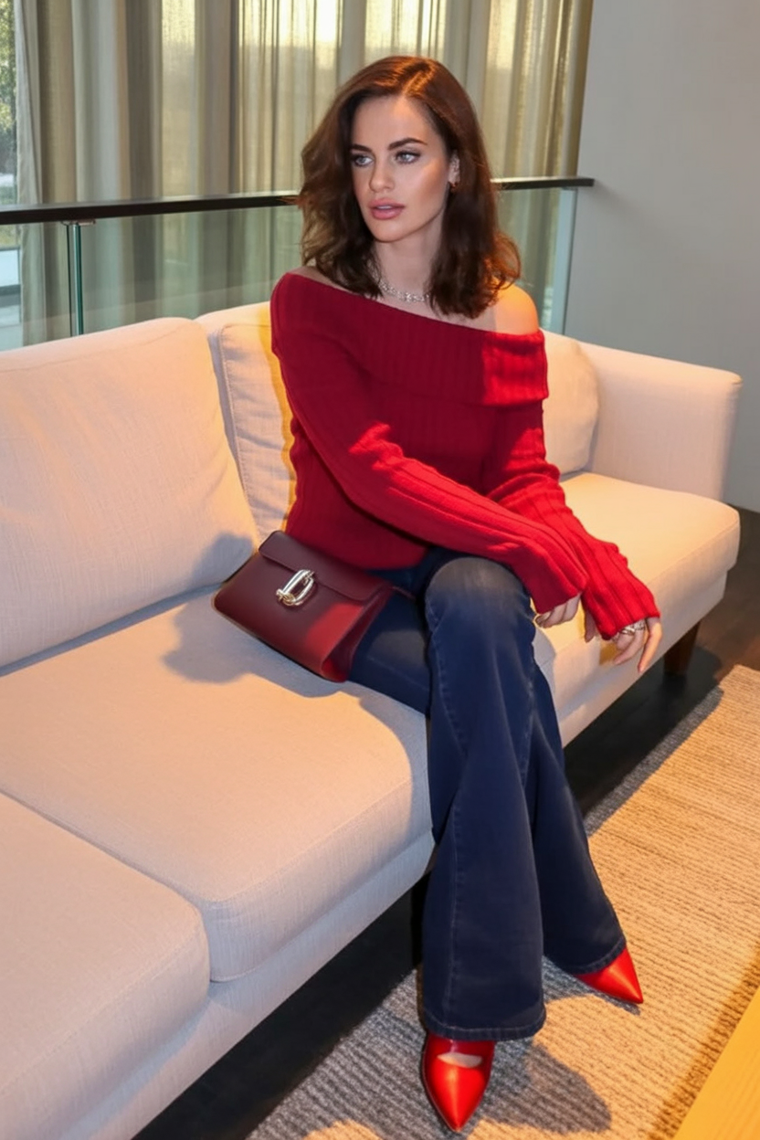 “I’m partying, but I want to stay cozy”—that”’s what this style embodies. The rich red off-shoulder sweater exudes the happy times in soft sophistication, but those statement shoes cover the celebratory aspect in boldness. It all combines so well—like having both a hug and a high-five at the same time.