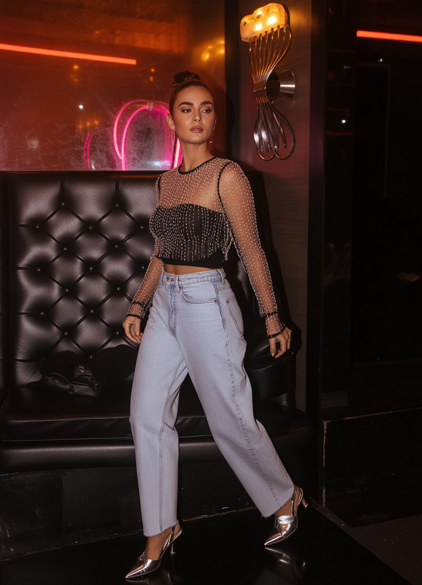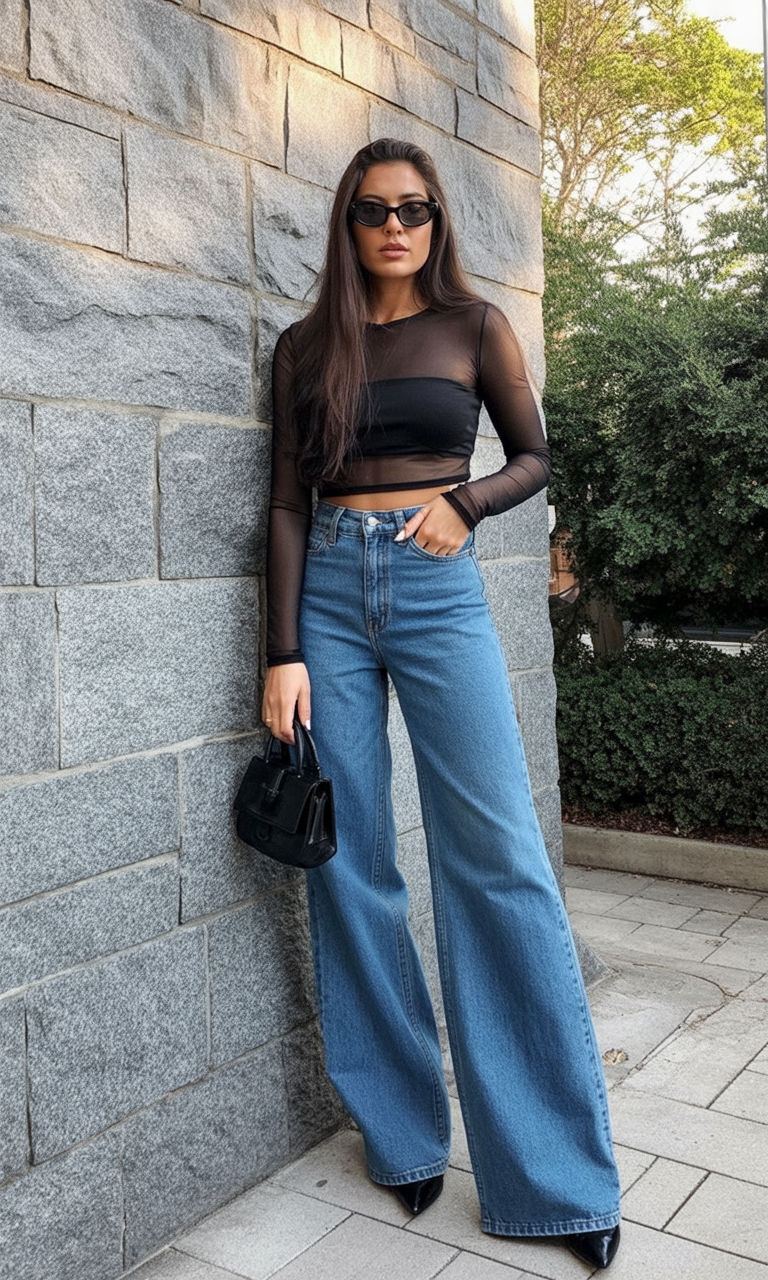Sleek, simple, and a little bit spicy—this outfit is the epitome of cool-girl casual. The sheer long-sleeve top paired with classic wide-leg denim gives effortless attitude. It’s like the fashion version of “I didn’t try… but obviously, I nailed it.”