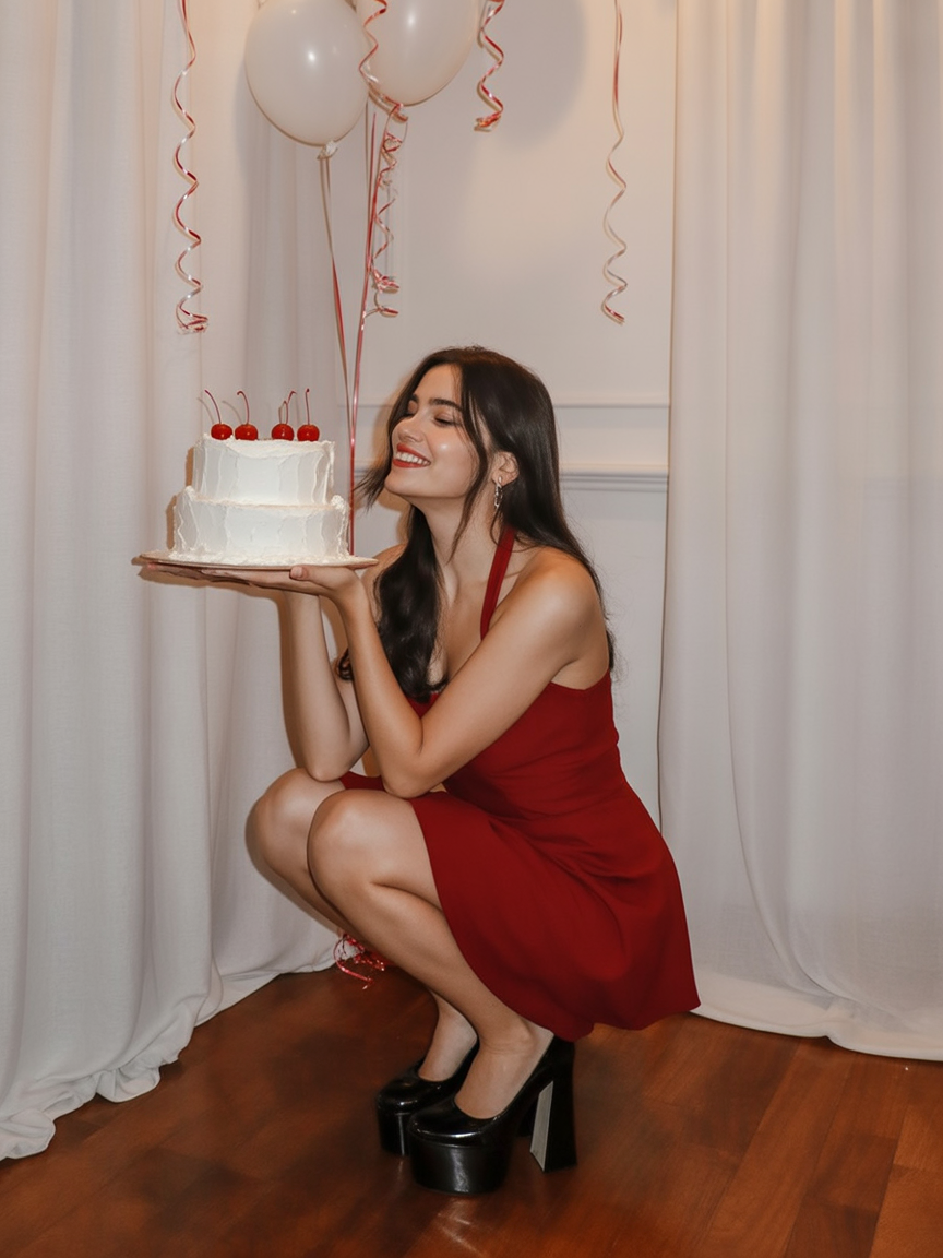 It’s all about birthday party vibes in every single detail of this getup. Cherry red halters, sky-high shoes, and balloons—how much more main character can you get, especially when you’re turning 18 or 21? It flatters most figures, and the mini gives plenty of energy without crossing that line into the ridiculous. It’s an amazing cute birthday party dress idea for females who want to make sure the party celebration stays festive, youthful, and totally in theme. Add some hoop earrings and a slice of cake, and you’ll be ready in time to capture the ultimate party photo.