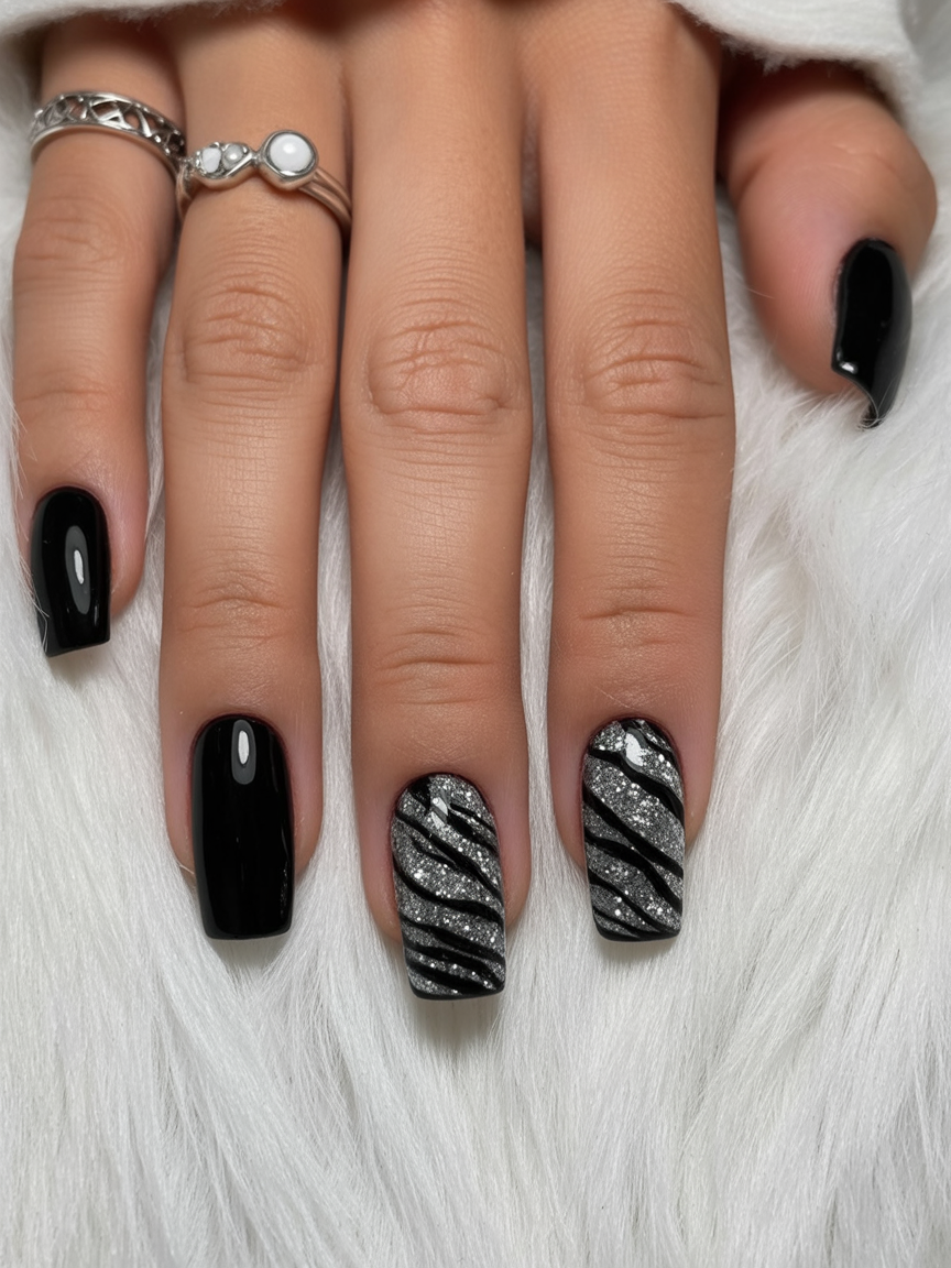This style works beautifully for short designs or mid-length square shapes, especially if you have thicker nails that can handle bold art. The glittery zebra stripes keep things interesting without feeling over the top, and they look fabulous against cozy winter textures like faux fur or chunky sweaters. Low-maintenance wearers will also appreciate how forgiving this pattern is when it comes to tiny chips or regrowth.