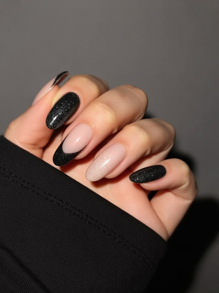 Here’s a modern twist on the classic French manicure — think midnight elegance with a touch of sparkle. The combination of nude and black tips creates a striking yet wearable look, while the almond shape adds just the right touch of femininity. It feels timeless and trendy all at once, like an old favorite that’s been reimagined for 2025.
