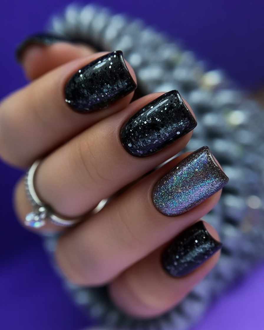This design looks like the night sky exploded into a galaxy of sparkles right at your fingertips. Black nails with flecks of shimmer feel deep and mysterious, while the holographic accent nail steals the show with its rainbow shift. It’s bold, eye-catching, and perfect for those who want their manicure to feel like a statement piece.