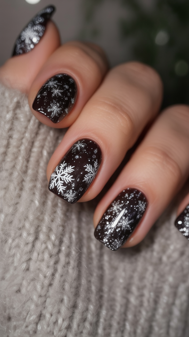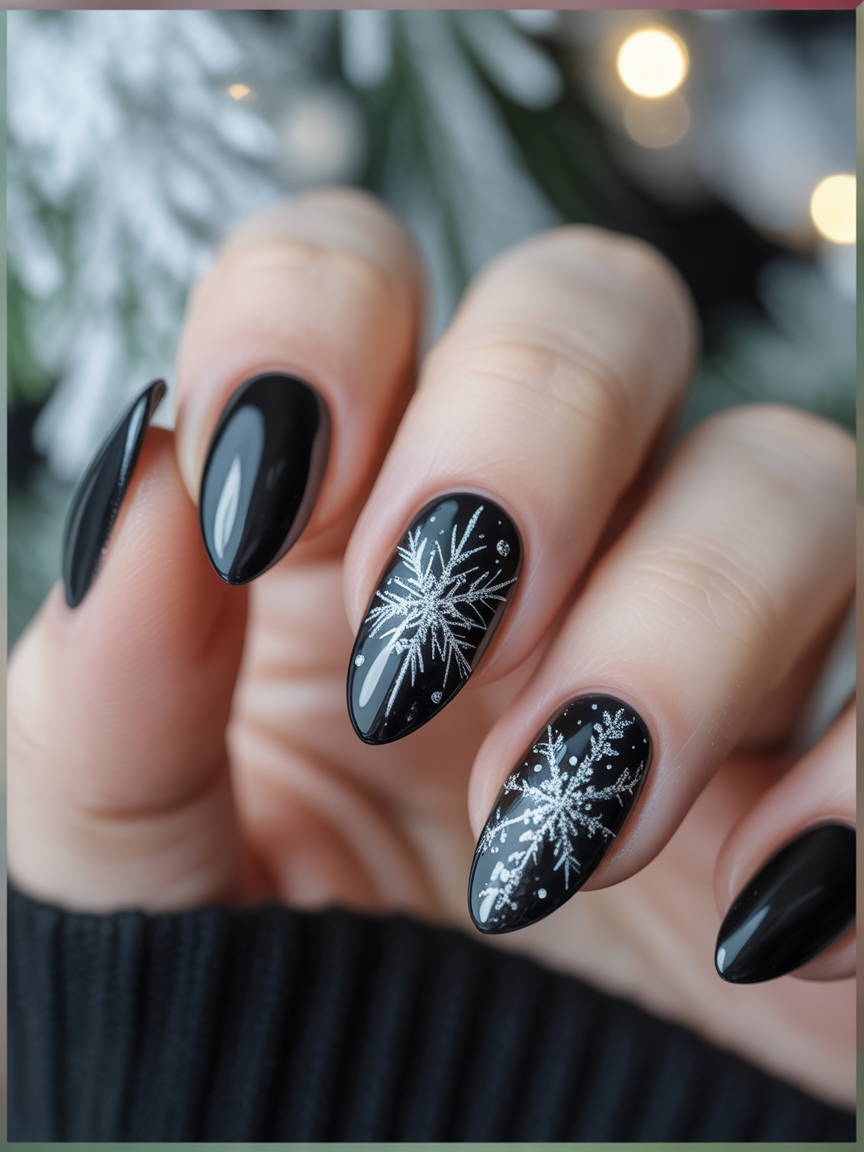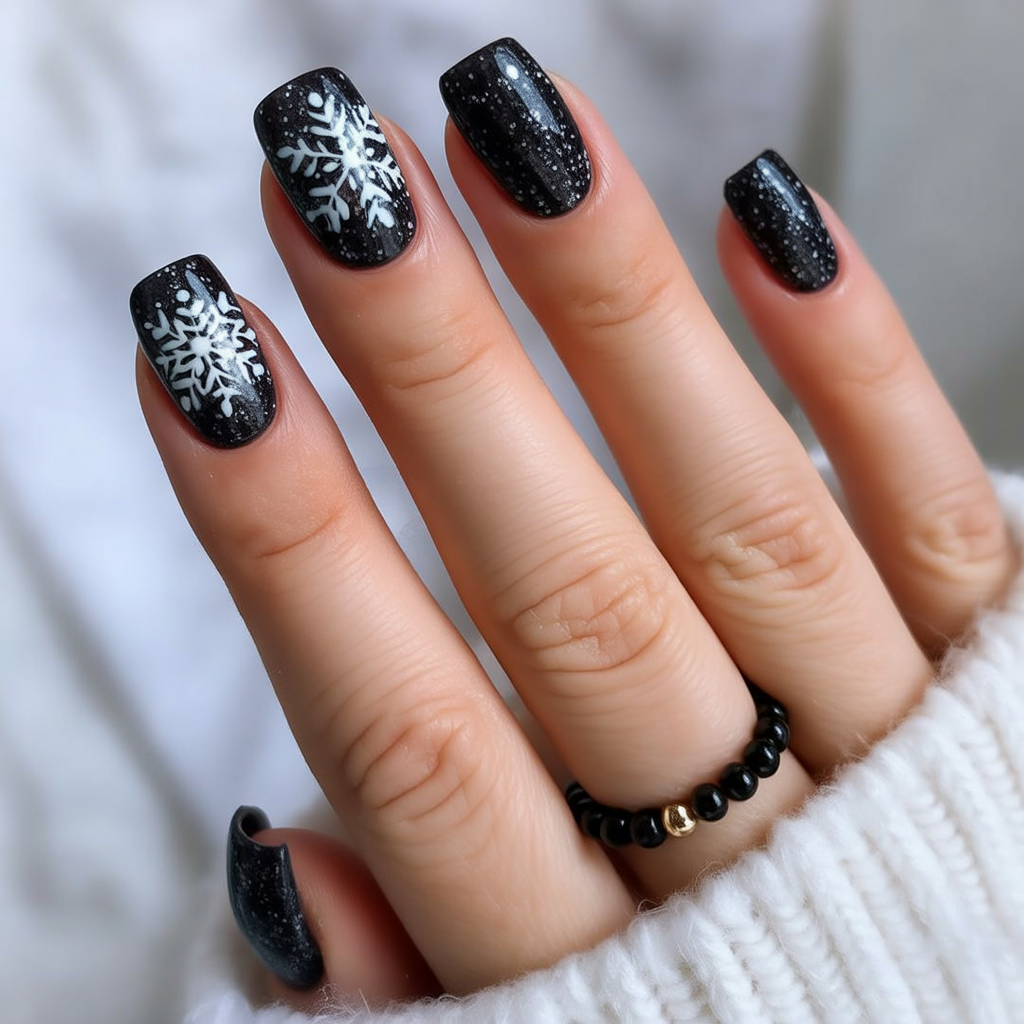 If you have naturally short nails, this is a perfect choice to dress them up without the need for length. The almond shape or square can both carry this look well, but the key is in the contrast: the crisp white and designs of snowflakes pop against the deep black base. It’s easy to maintain and pairs with cozy knits or metallic accessories for a festive edge.
