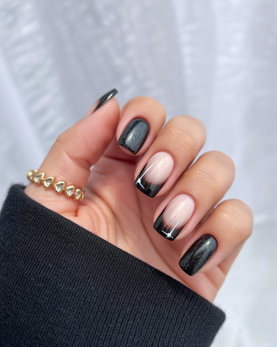 What makes this design stand out is how wearable it is. Whether you keep your nails short or go almond for drama, the balance of shimmer and simplicity works beautifully. It’s also low-maintenance: the nude base hides regrowth, while the dark tips protect against chips. A classy, no-fuss option if you want a little edge without daily upkeep.