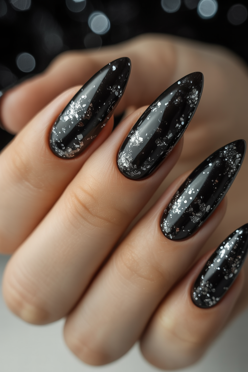 These long almond nails in glossy black sprinkled with silver glitter look like a midnight snowfall captured under moonlight. They have an alluring, slightly mysterious aura that makes them perfect for both holiday parties and chic everyday styling.
