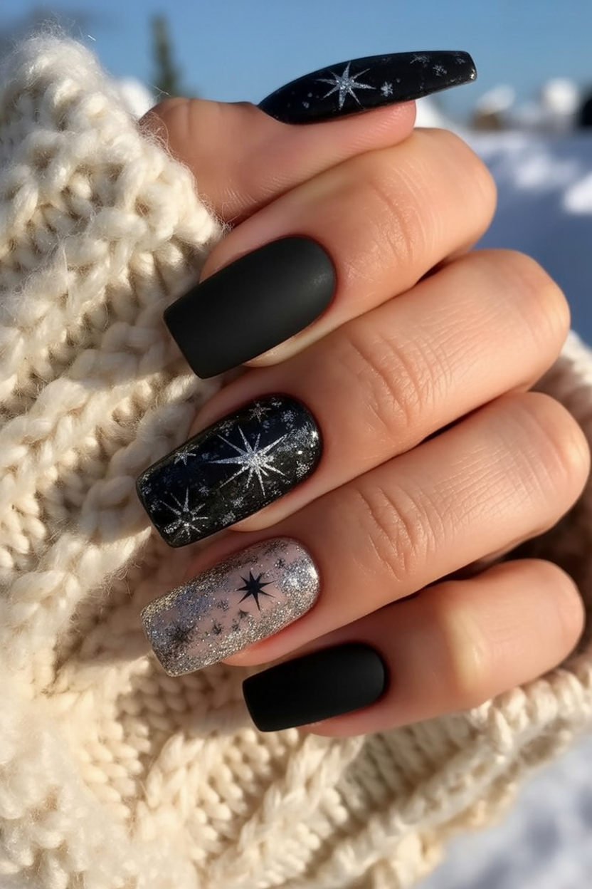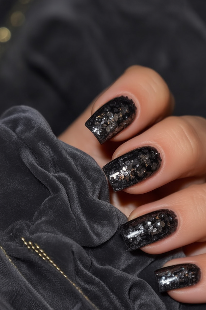 There’s something magnetic about black nails dusted with glimmers of silver and gold. This look feels like a starry night sky bottled up onto your fingertips—bold, glamorous, and perfect for winter evenings. The chunky glitter reflects every bit of light, making it an instant conversation starter at any holiday party or cozy dinner gathering.