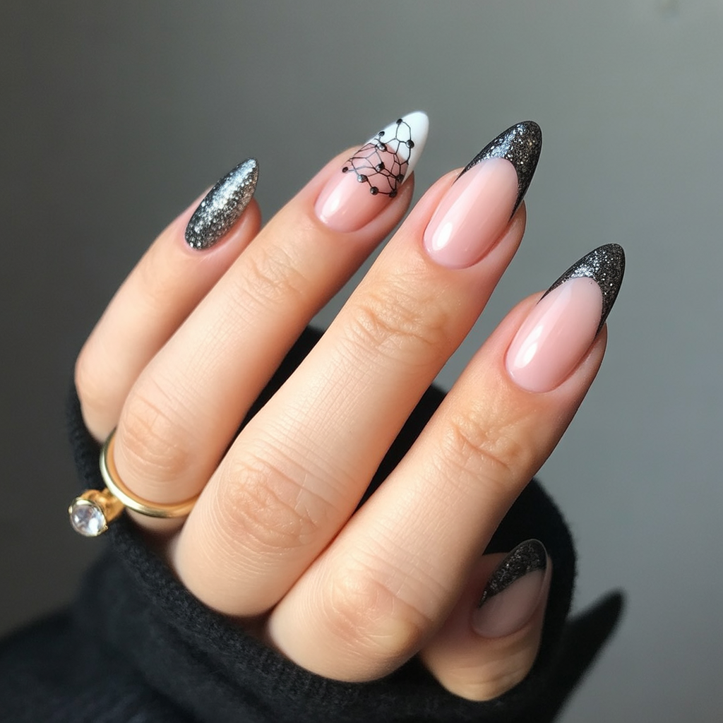 This manicure feels like a whisper of elegance with a playful twist. The nude and black base with its glittering French tips is softened by a lace-like accent design that adds depth and intrigue. It’s romantic, edgy, and quietly sophisticated — a perfect winter evening look.