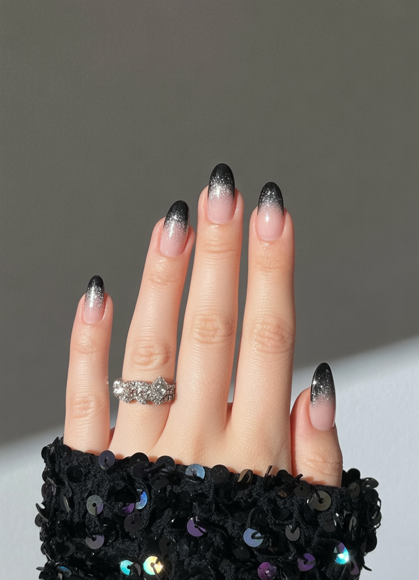 Like smoke rising into the night sky, these black-to-clear ombre nails create an effortlessly modern vibe. They’re sleek, refined, and just a little bit mysterious—perfect for anyone who wants elegance without loud designs. The subtle shimmer sprinkled through the fade makes them feel polished enough for winter parties yet wearable for everyday moments.