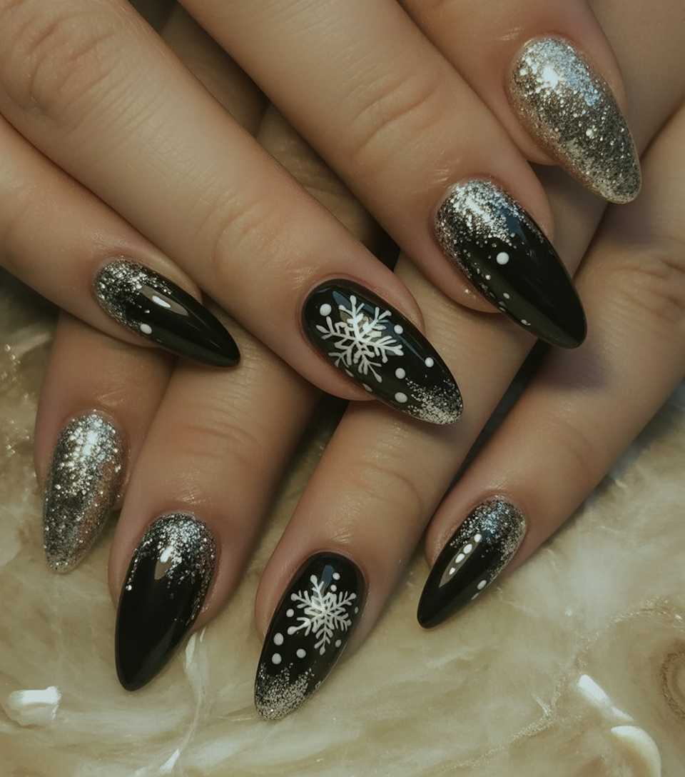 Winter in nail art form—these black and silver nails decked with delicate snowflakes look festive yet elegant. The mix of glittery tips and crisp white and designs adds a playful seasonal charm, almost like stepping into a snow globe.